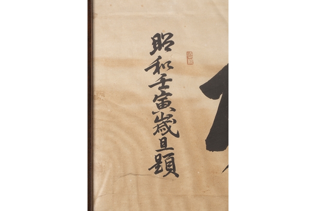 This Japanese calligraphy writing has four main characters in the middle, with signature and dates on the sides.