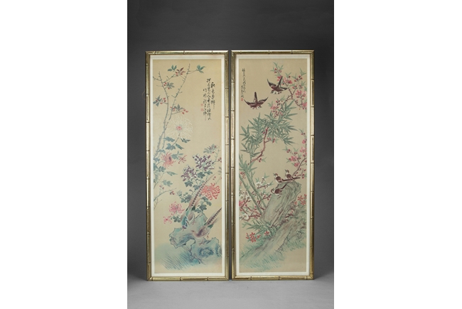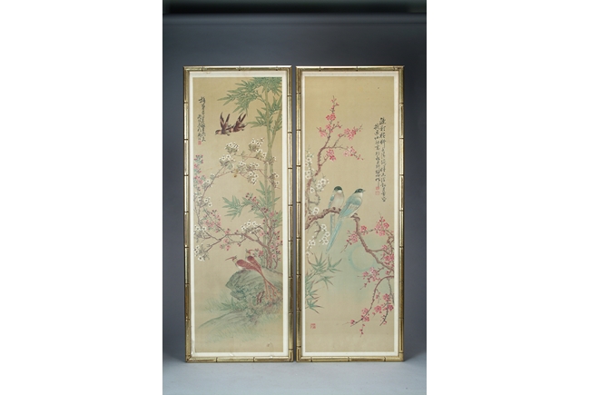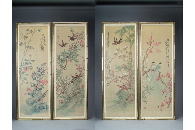 Four paintings total, each depicting a different season with birds, flowers, and a poem; all have artist mark on the side.