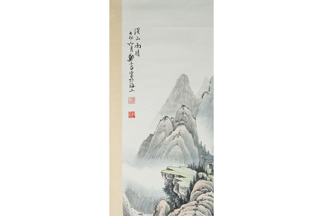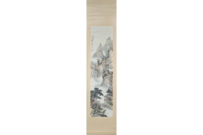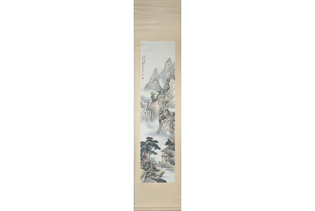 The painting depicts mountain ranges, rivers, and a fisherman walking across the bridge; has artist mark.