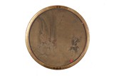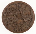 A wooden carved battle scene round plaque