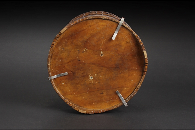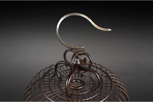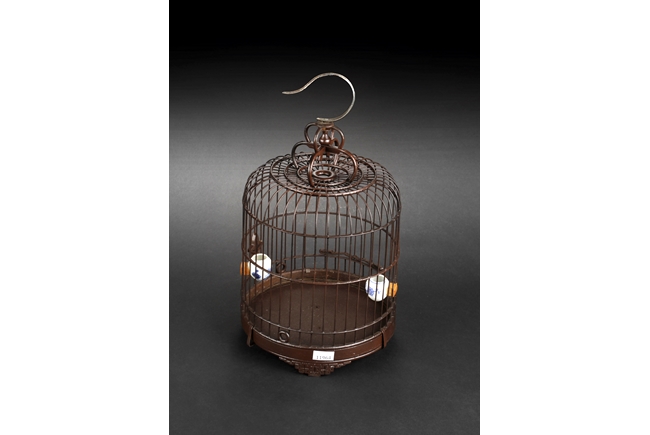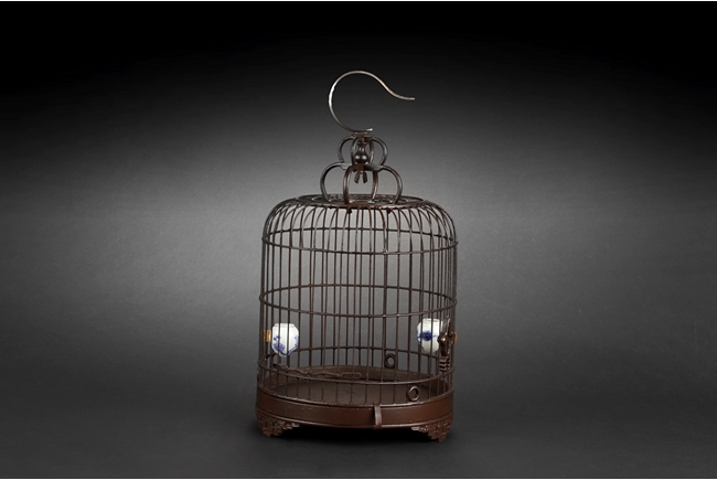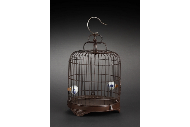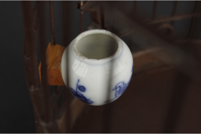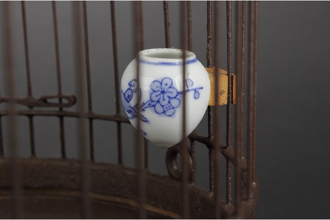 The cylindrical cage was made from bamboo, with two blue and white porcelain bird feeders attached to the side, depicting plum flowers and birds, top attached with hanging hook.