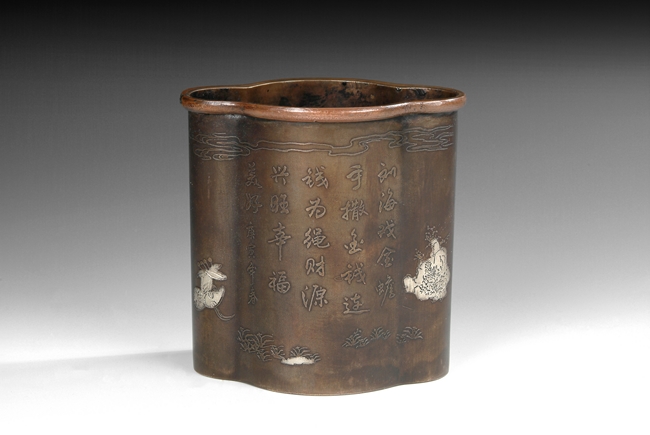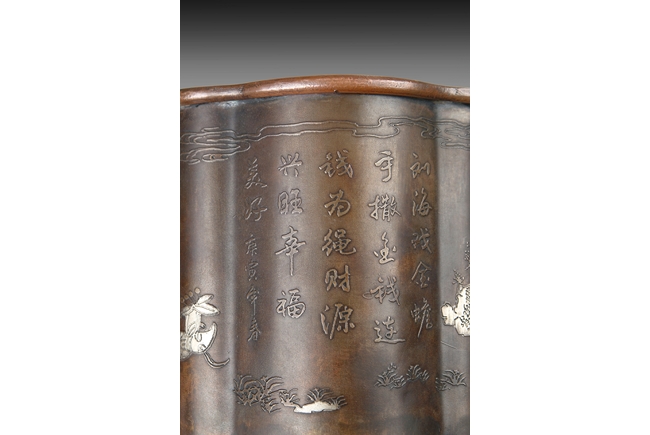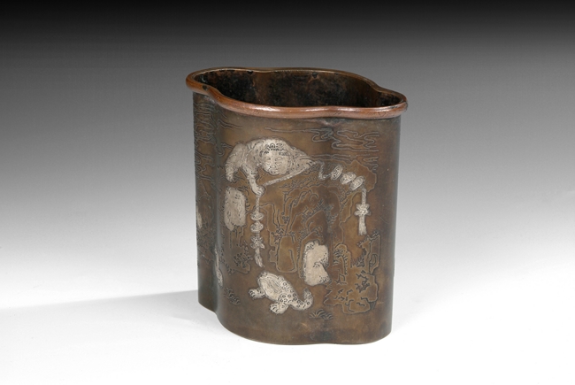 Of compressed globular form, the small gilt silver washer stands on three tall legs, rises to a body with flower and vine patterns, two lion mask handles, and everted rim. Bottom bears a one character "XUAN" mark.