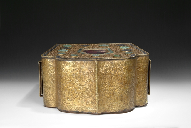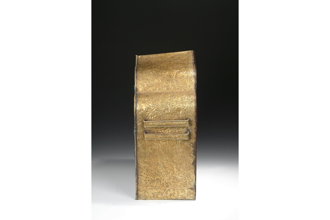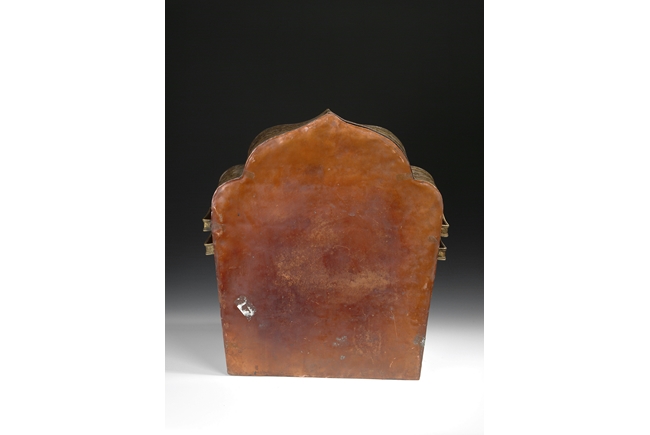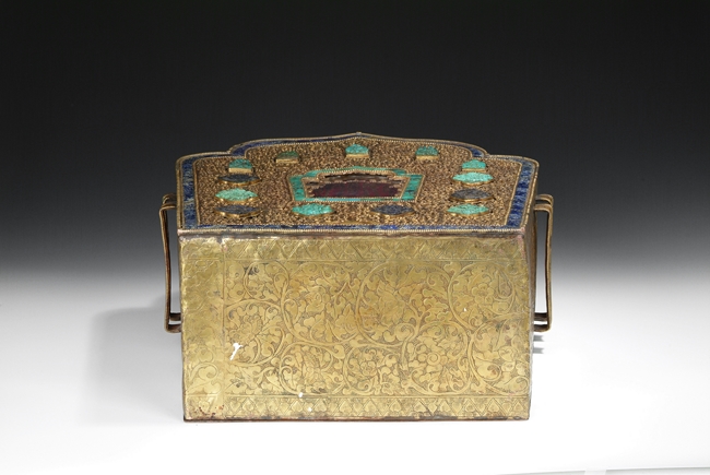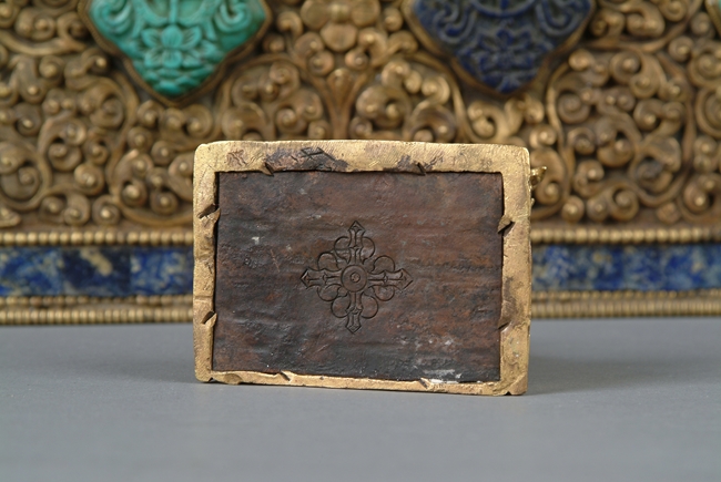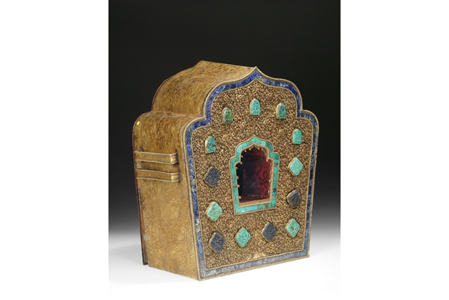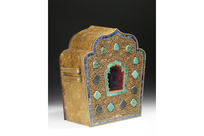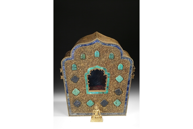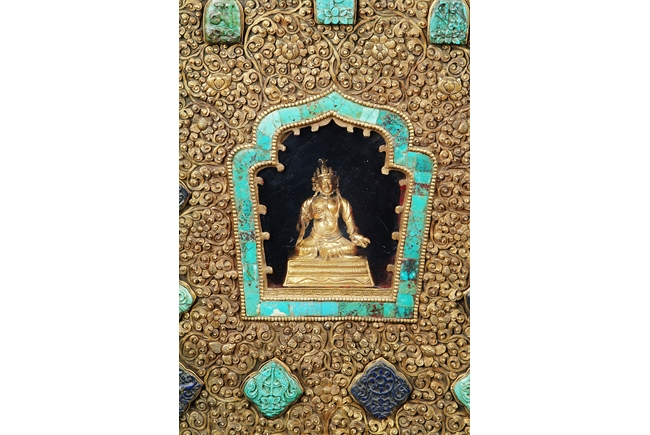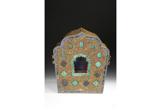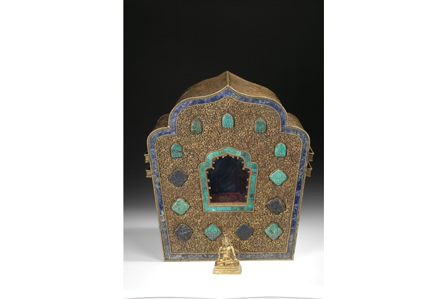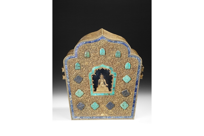 The arch shaped Gahu box with a central frame, housed a Jambhala seated on square plinth, the front embossed with floral patterns and decorated with carved turquoise and lapis lazuli, the sides with two strap holders. 18th century.