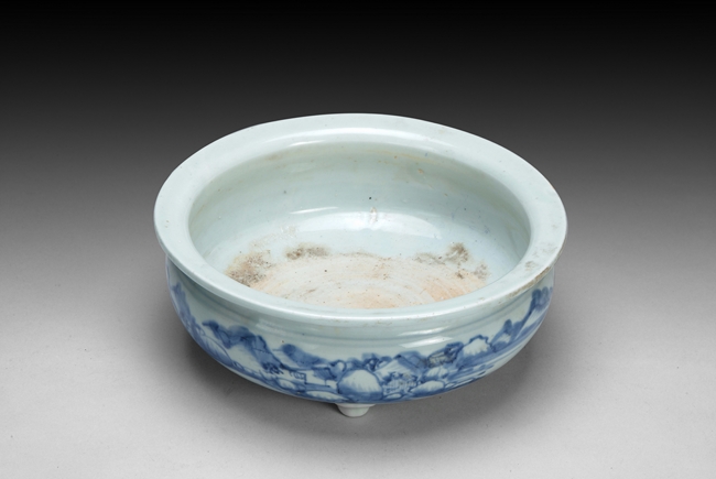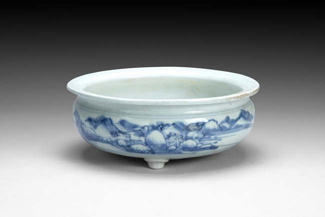 Of flattened globular form, supported on three short legs, the blue and white censer has a scene of water, village, and mountains on the body. Qing Dynasty period.