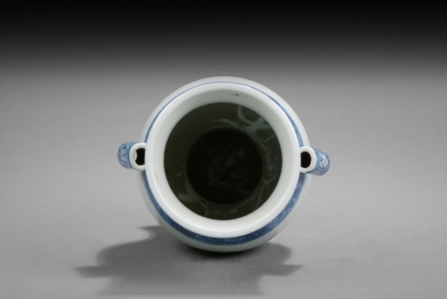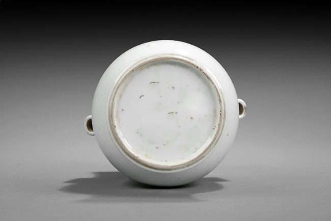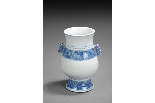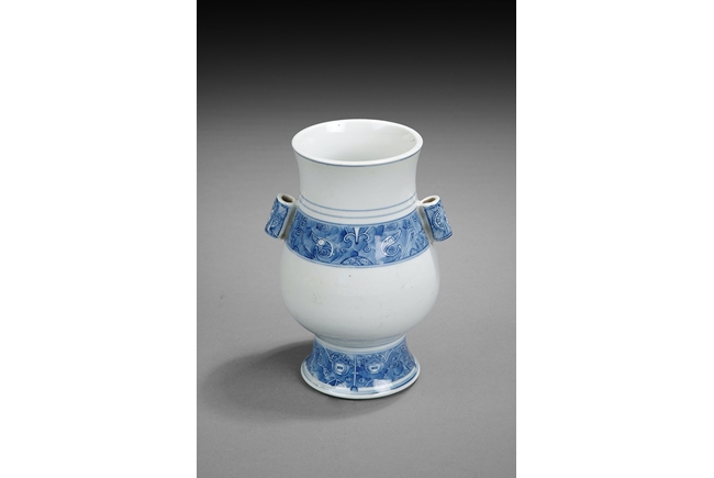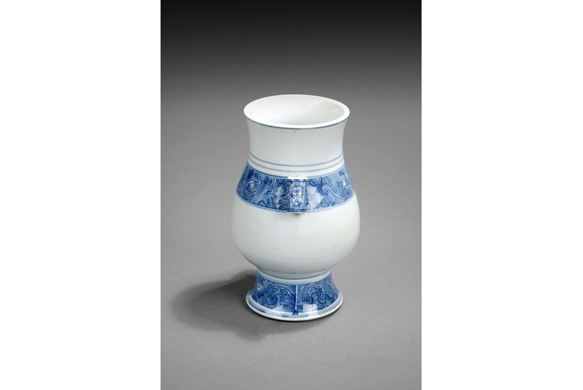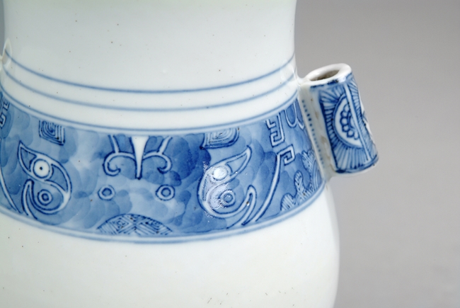 Stands on flared foot, the body and foot painted with scrolling band of beast mask patterns, encompassing a pair of lug handles. Late Qing Dynasty period.