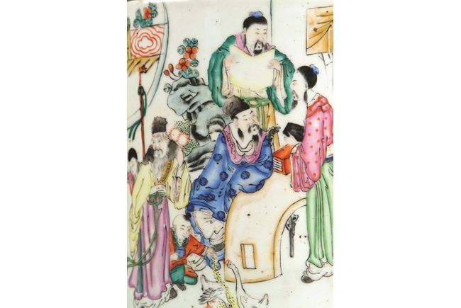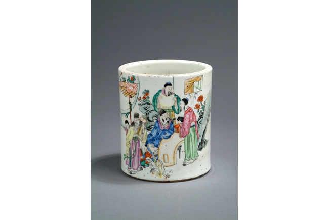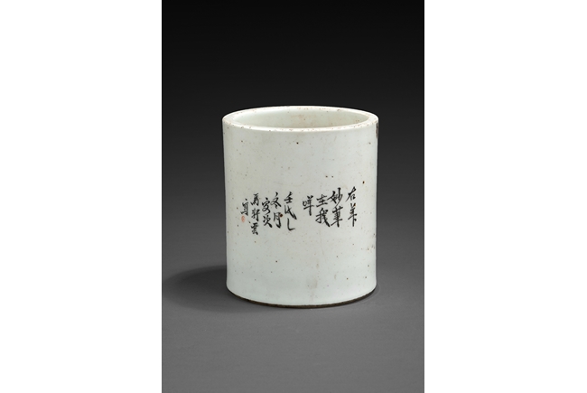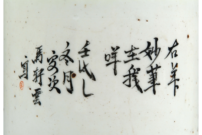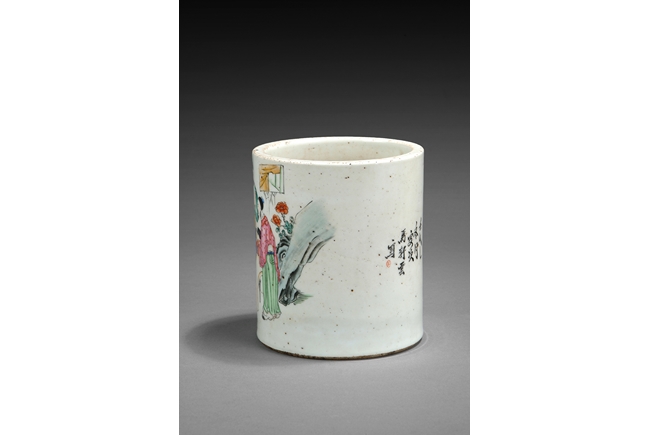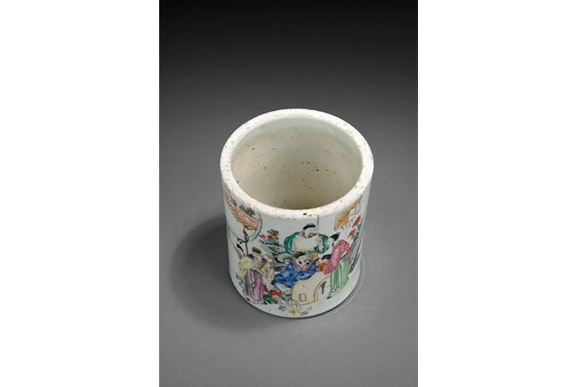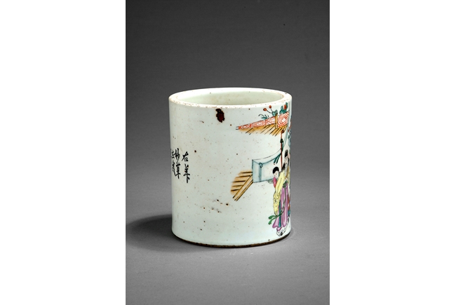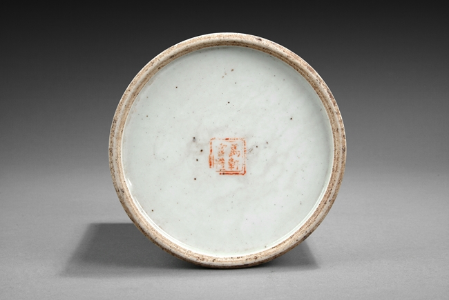 Of cylindrical shape, enameled around the exterior with a scene that depicts a few scholars and a child gathered in a garden setting, a set of calligraphy and artist seal on the back, all reserved on an white ground with a four character "MAYUNXUAN" mark on the bottom. Republic period.