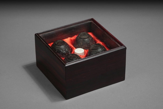 Intricately carved, the wine cups made from coconut shells, with exterior carved in low relief of bamboo, trees, and flowers. Age related wear and slight damage. Qing Dynasty period.