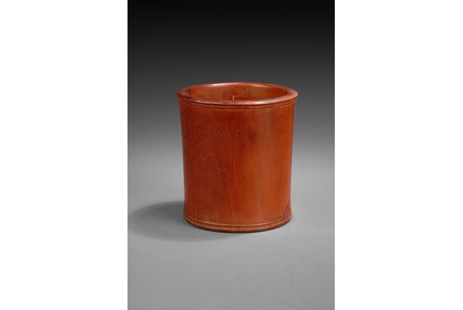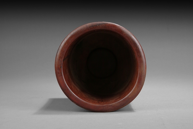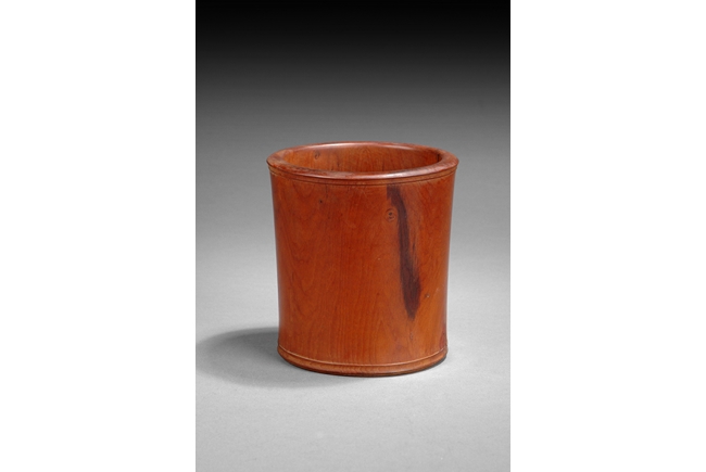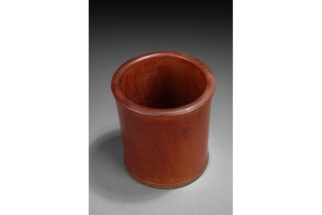 The Huangyangmu brush pot is of tapering cylindrical shape, with fine grains and rich color. It is completed with an en-suite plug.
