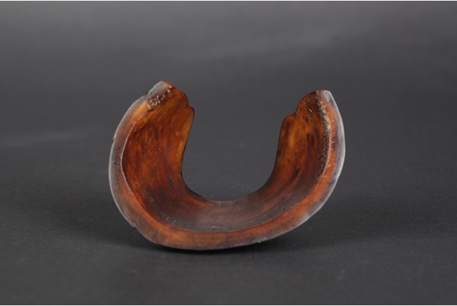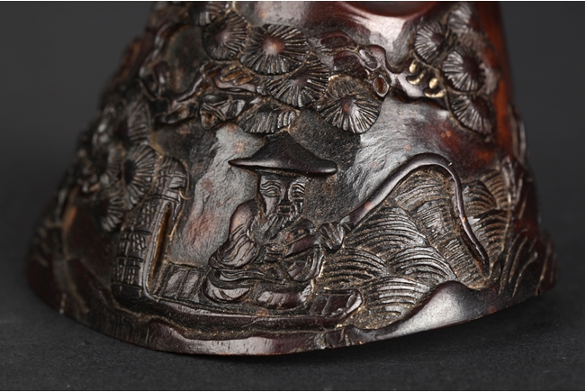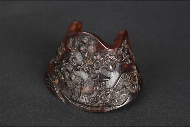 A brush holder carved from horse hoof, depicting an old man fishing under a tree next to a river. The carved scene also includes pine trees, cranes, river, and bow. Qing Dynasty Period