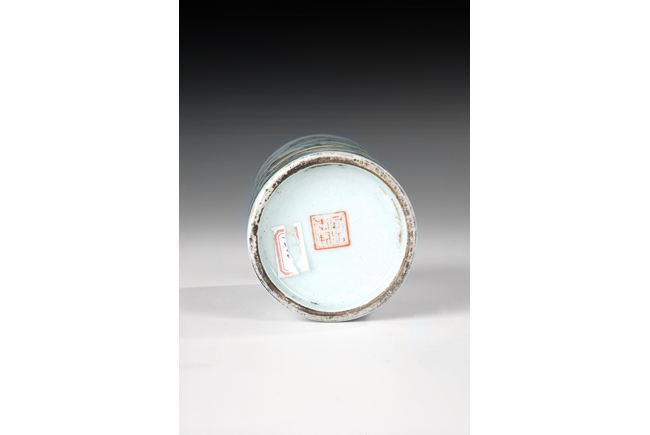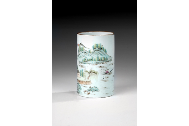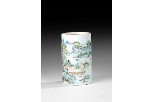 Of cylindrical form, the brush pot depicts a mountain, river, and village scenery, with trees, villagers, and rocks scattered around. Four Chinese characters and artist mark on the top, and four characters "TONGZHI" mark on bottom. Qing Dynasty period.