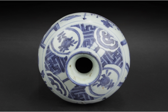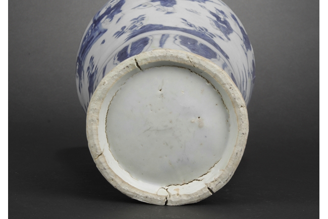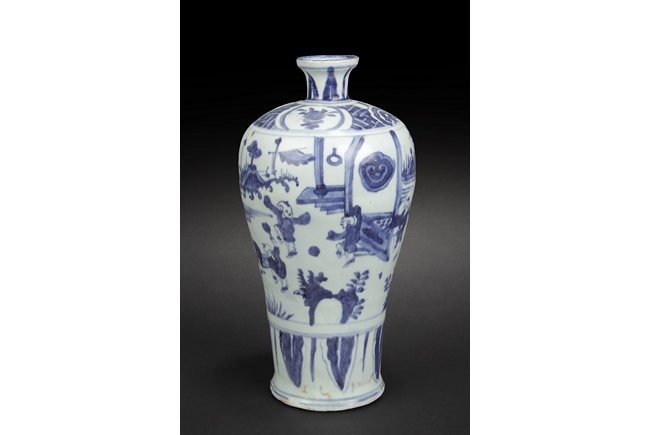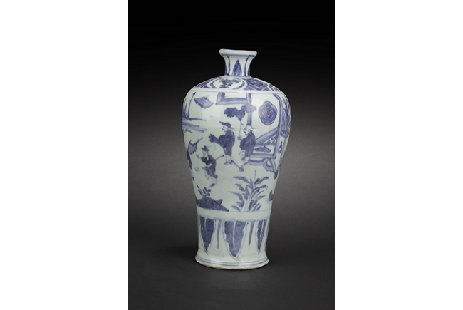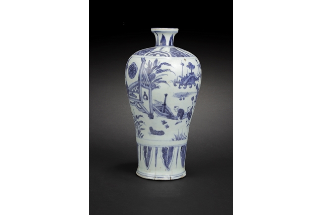 The body tapering from the high rounded shoulder to the gently spreading foot, covered on the exterior with a scene of kids playing around a fishing village setting, with river, fishermen, boats, and huts. Ming Dynasty period. Some cracks on the vase and base.