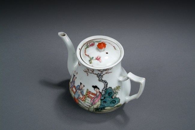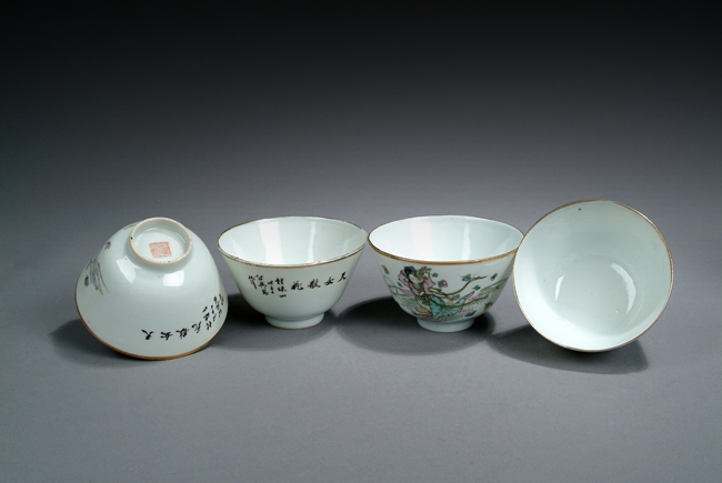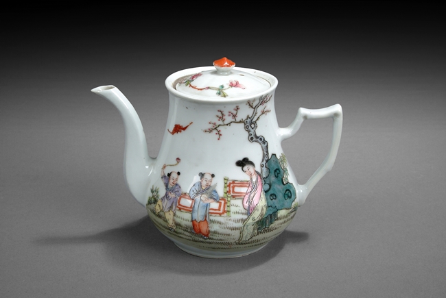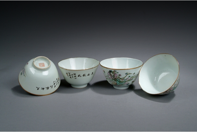 The set includes ten porcelain bowls and one porcelain teapot. The bowls depict a celestial beauty flying through the clouds and spreading flowers from a flower basket, with Chinese calligraphy on the back and four characters mark on the bottom. The teapot depicts two children playing in a garden setting with a lady on the side, with four characters mark on the bottom. Republic period.