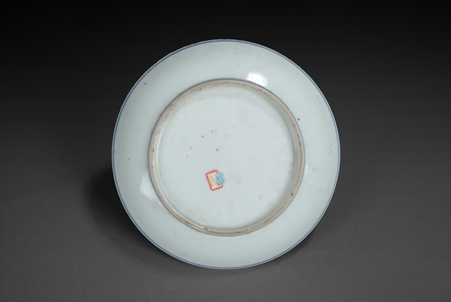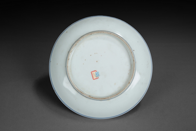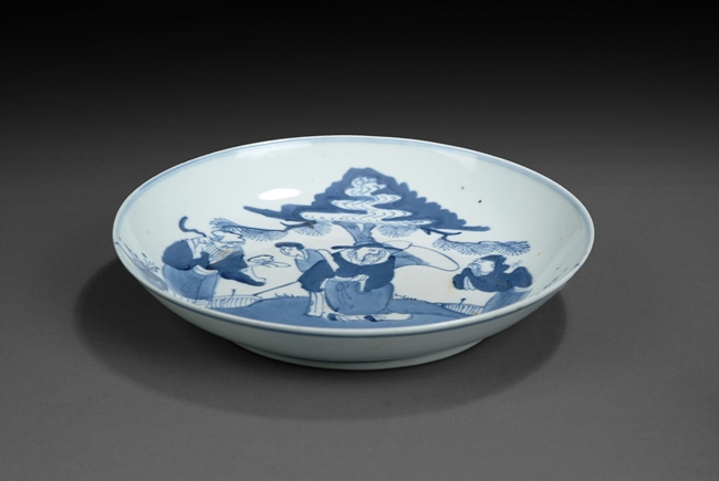 Finely detailed with a double line on top of plate, with a scene of three scholars and an attendant conversing under a pine tree in the outdoors setting.