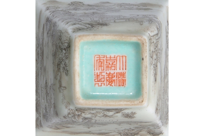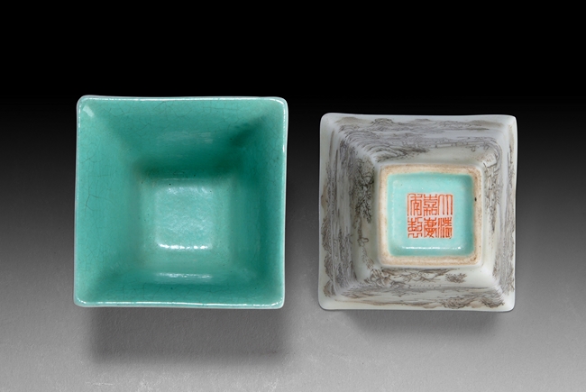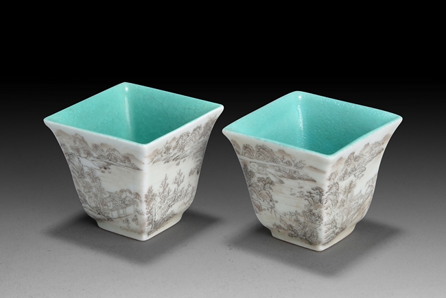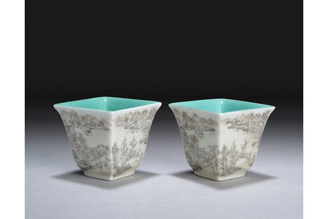 The exteriors of this pair of grisaille painted square cups were painted with a landscape scene using grisaille painting. Both the interiors and the bases were glazed in turquoise color and each bears a six character "JIAQING" mark. Qing Dynasty period.