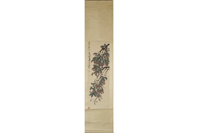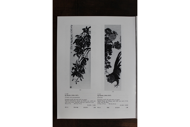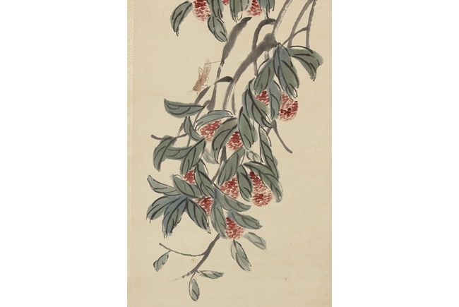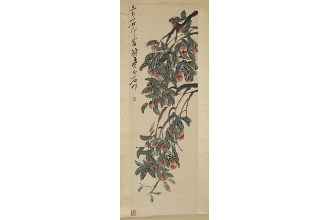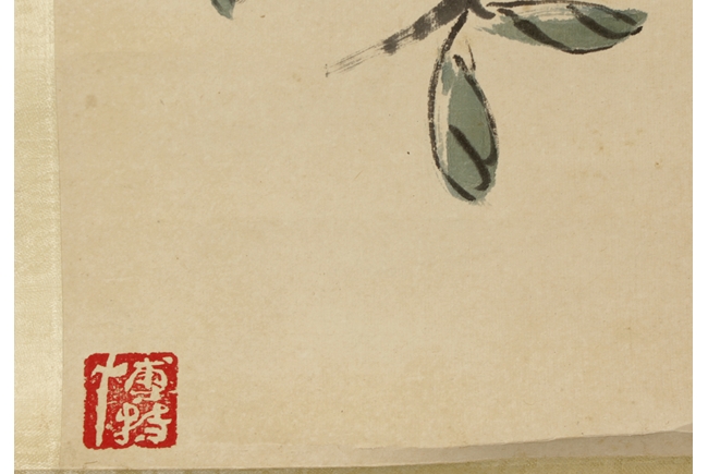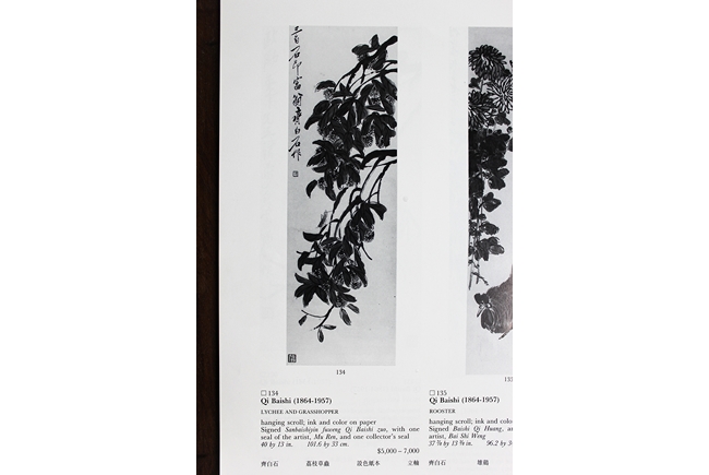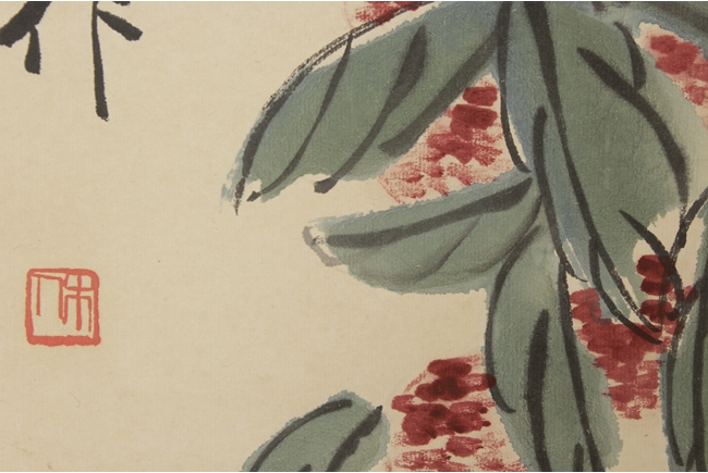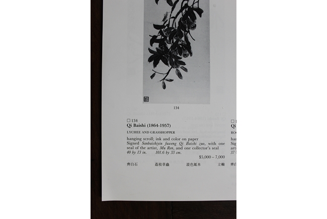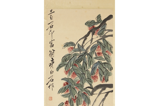 "Hanging scroll; ink and color on paper. Signed Sanbaishiyin Fuweng Qi Baishi Zuo, with one seal of the artist, Mu Ren, and one collector's seal.