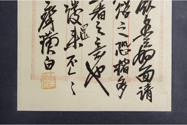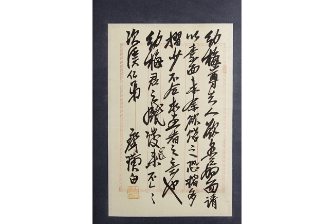 A letter with five lines of Chinese characters written by Qi Baishi to "Youmei", with artist signature Qi Baishi and mark on bottom left.