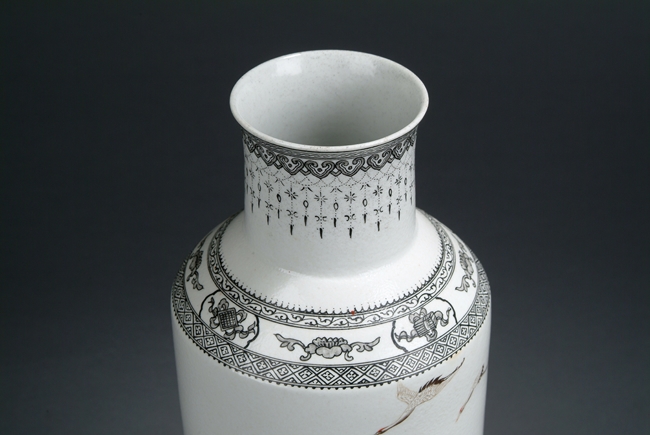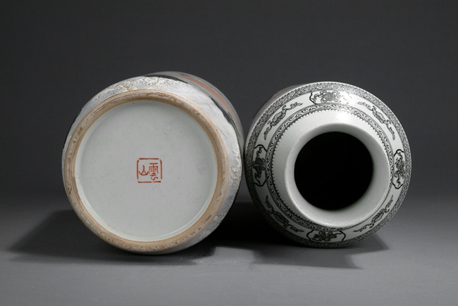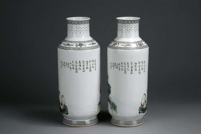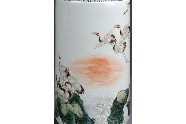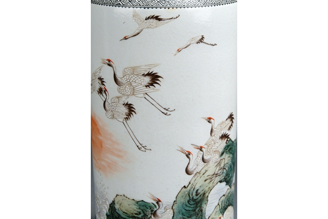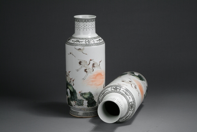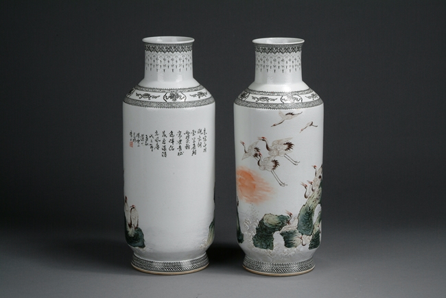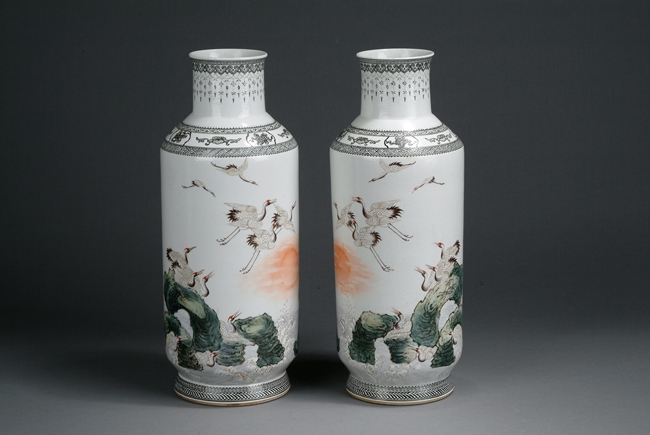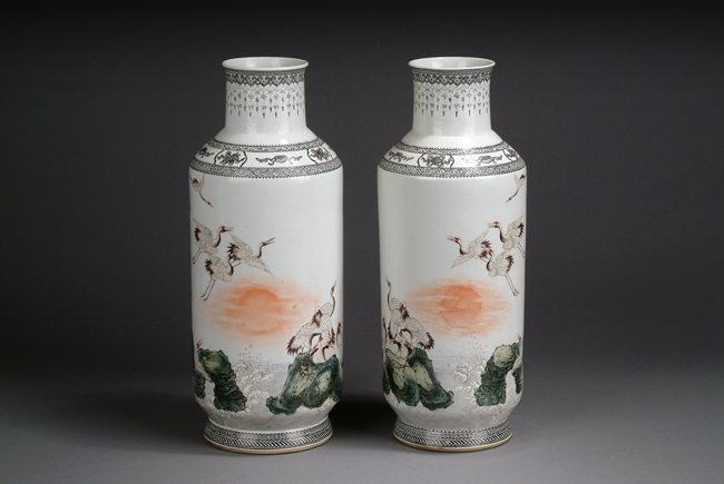 A pair of Republic famille rose vase, depicting an ocean side scene with groups of cranes, looking or flying towards the sun. Chinese calligraphy and artist mark on the side, and a two characters "YUNSHAN" mark on the bottom. Republic period.