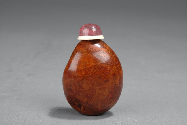 Of ovoid shape, the body has dark brown color and swirls of orange with hints of black, capped off with an amethyst stopper. Missing spoon. Qing Dynasty period.