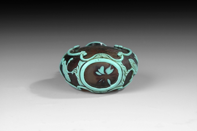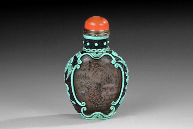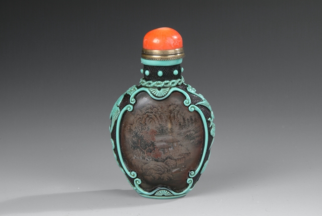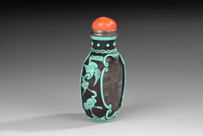 Of flattened ovoid form, fluidly carved through the turquoise overlay with a continuous scene of cranes on the narrow sides, all surrounding two landscape scenes with mountains, houses, river, trees, and fisherman. Capped with coral stopper.