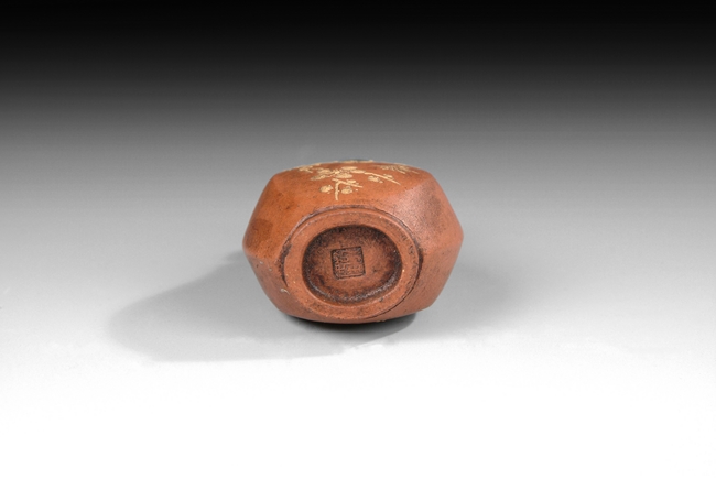 Of rounded and flattened hexagonal form, the bottle is finely painted in beige slip on the brown Zisha stoneware ground with bamboo on one side and chrysanthemum flowers on the reverse. Capped with an agate stopper, and two character "QIANLONG" mark on the bottom.