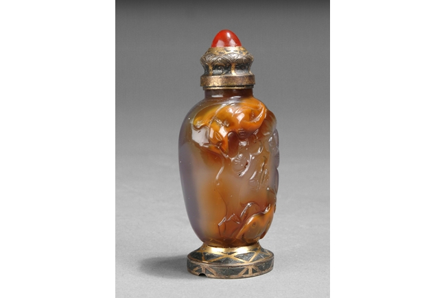 Of rounded, rectangular shape, the bottle well carved through with two russet-brown animals on one side, a bird and a squirrel. There is a pine tree standing between the two animals; The top and bottom are encased in bronze with triangular design and gold colored lines. A colored glass lies on top of the stopper with narrow hole. Qing Dynasty period.