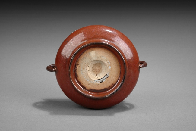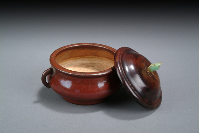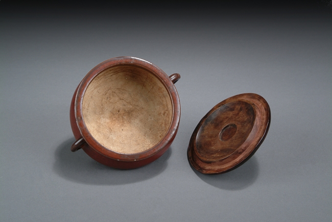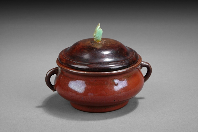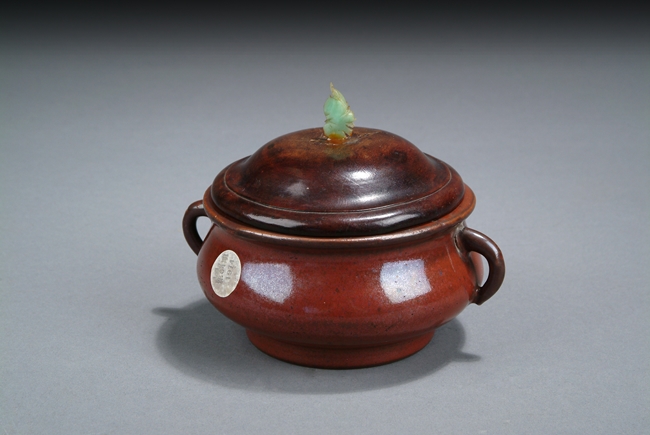 Of compressed globular form, the deep rich red evenly glazed over body, two handles on the side, with wooden lid finished with jade finial on top. Qing Dynasty period.