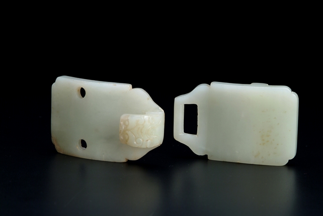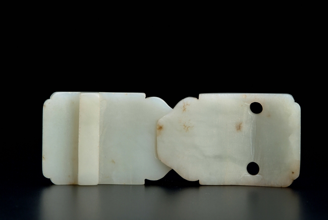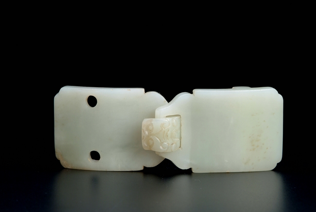 This jade buckle is rectangular shaped with curves; features a tiger head as the clipping point, and two holes on the piece.