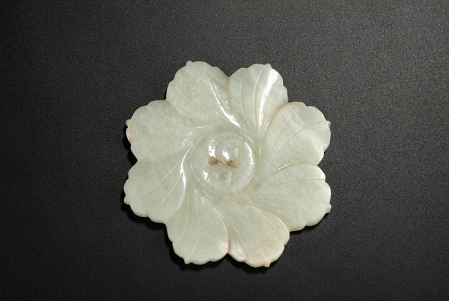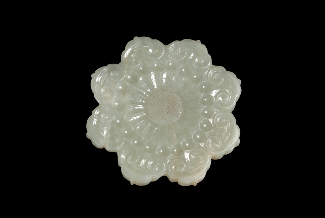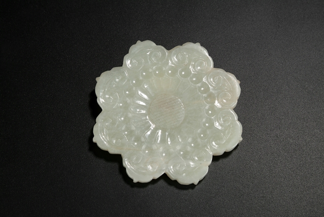Carved in low relief on one side with a central chrysanthemum blossom with two rings of petals and a cross-hatched center, surrounded by eight Ruyi heads, the reverse carved with a Taiji symbol surrounded by eight swirling petals, the stone well polished and of white tone. Qing Dynasty period.