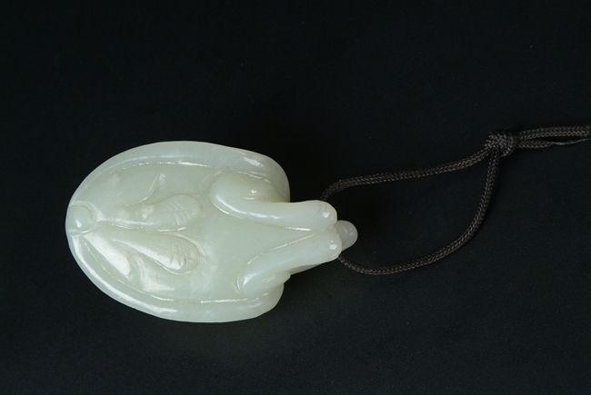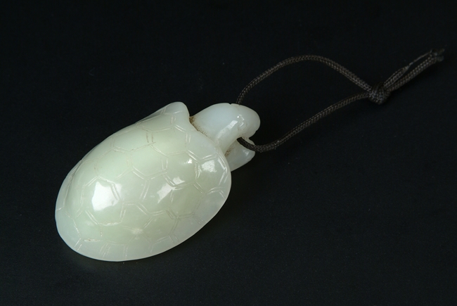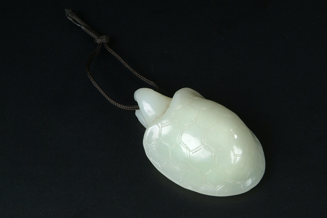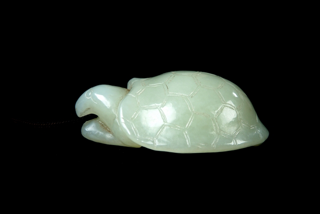 A finely carved jade turtle with its head peaking out curiously and four legs stretched forward. Period of Qing Dynasty.