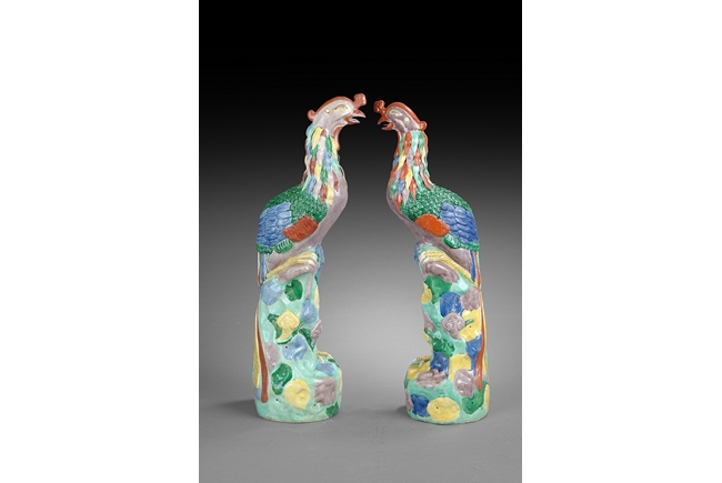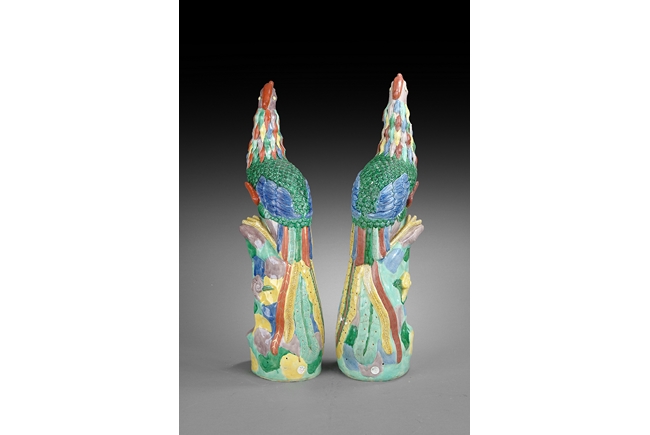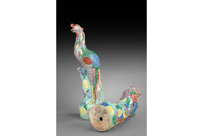 Standing upright on one leg, the phoenix is turned slightly, with closed wings and tail feathers draped on ground. Each long tail feather is colored differently, as the feathers on the phoenix, with red, green, blue, and yellow, while tinted violet was used for the body color. Early 19th century.