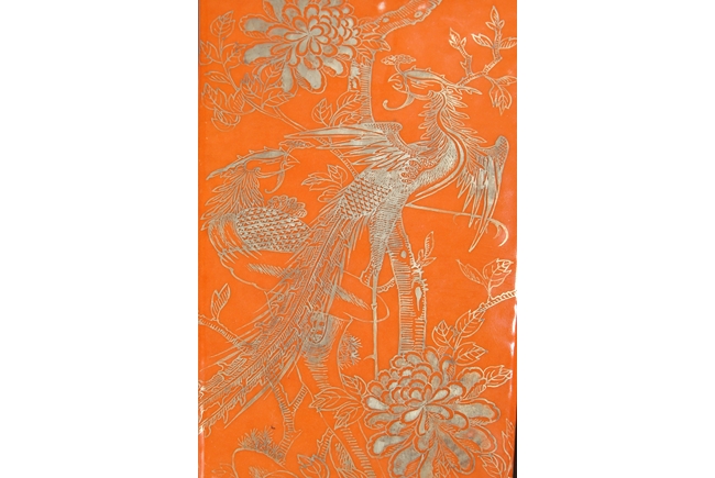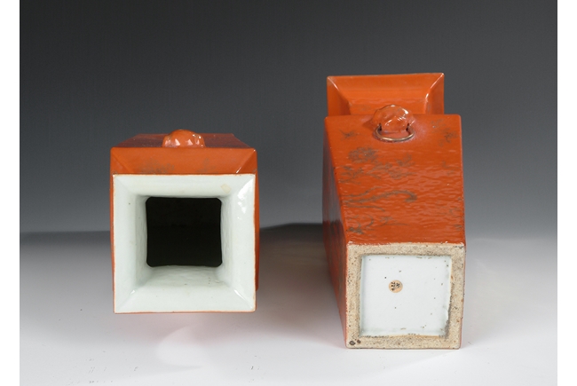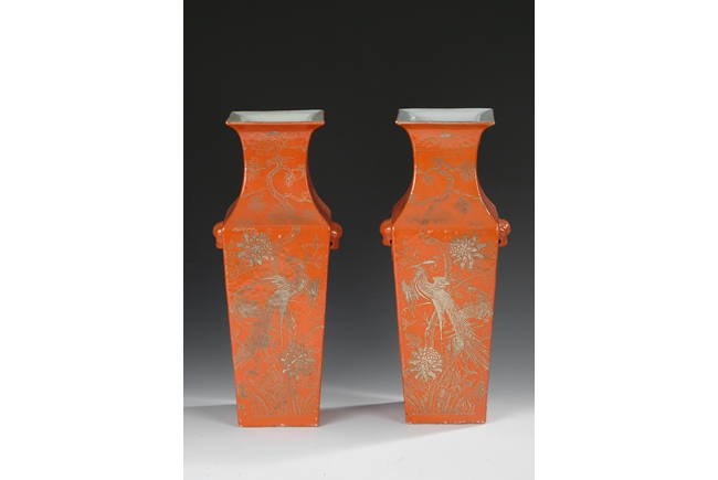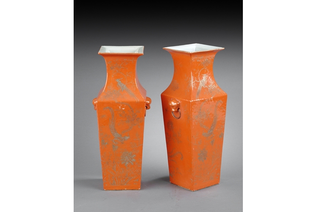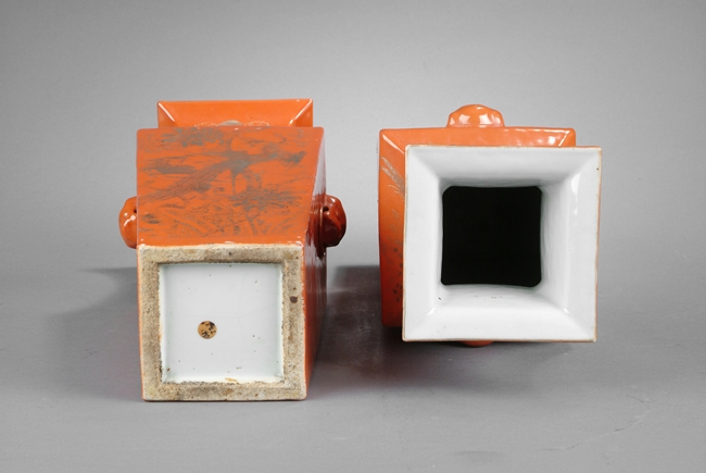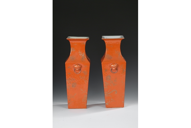 Of rectangular shape, with waisted neck and body tapering downwards, two lion head masks with ring handles on the side, front gilt painted with birds and flowers over orange-red ground. Republic period.
