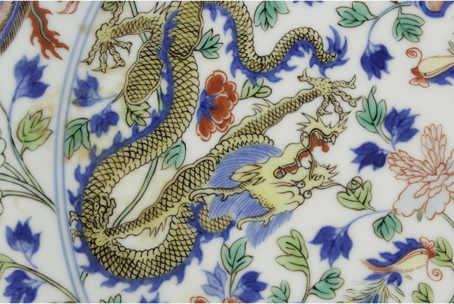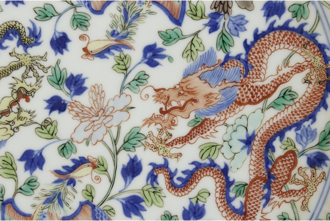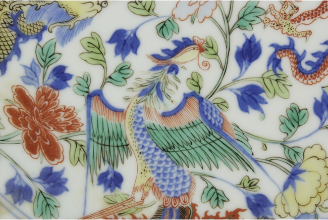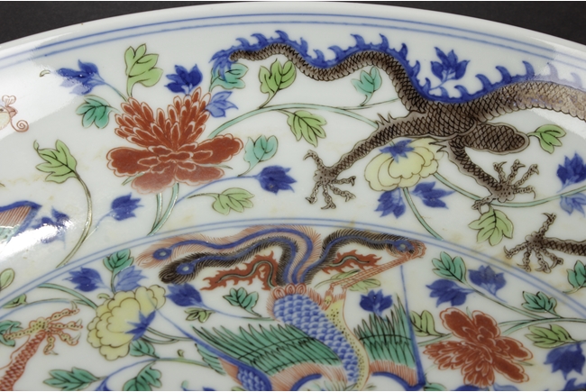 Finely potted with gentle sides, well-rendered around the exterior and interior of the charger decorated with vivid enamels, depicting dragons and phoenix flying through patches of different exotic blooms of flowers and vines, confronting and encircling one another, totaling six dragons and six phoenix. The top, interior, exterior, base, and mark all have double circle patterns. Bottom bears six characters "KANGXI" mark. Qing Kangxi Dynasty period. Provenance: Sold by Hong Kong antique store to Taiwanese collector Mr. Chai in 1962, and Taiwan Kaohsiung collector Mr. Chen purchased from antique store Chaoshoulou from 1982 to now.