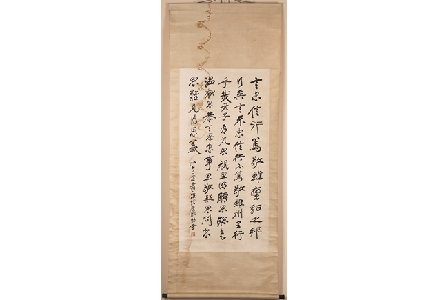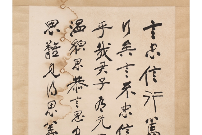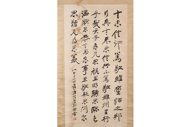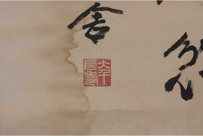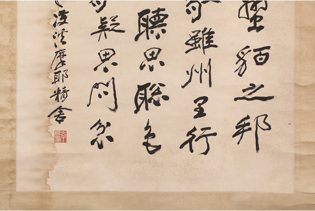 This well-written Chinese calligraphy painting is written with a Chinese ink brush and stamped with an artist mark "Zhang Daqian" on the bottom left. Noticeable water damage.