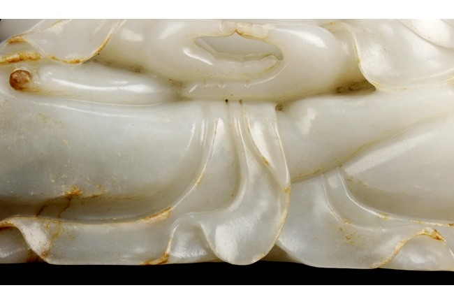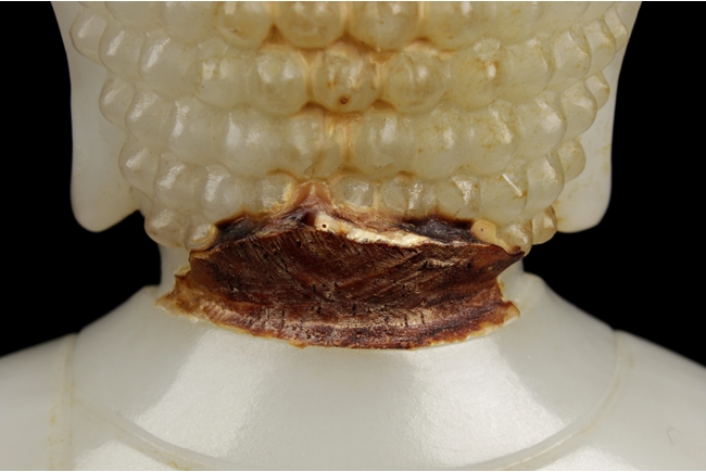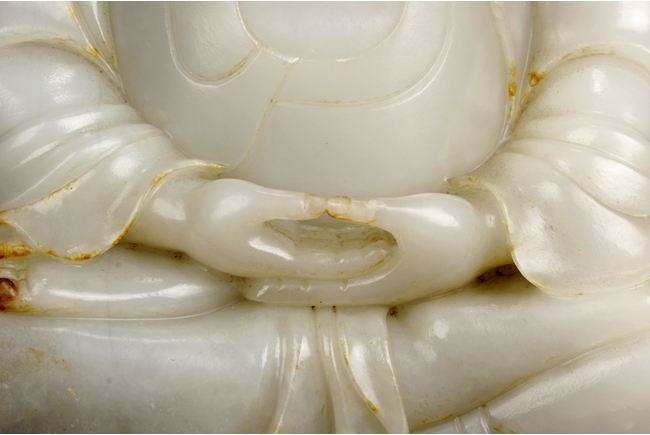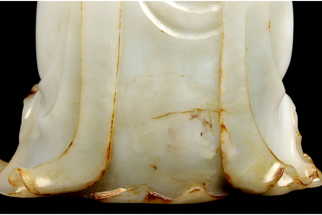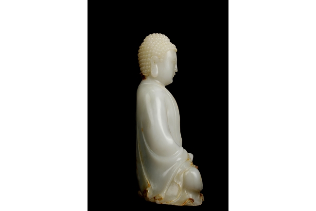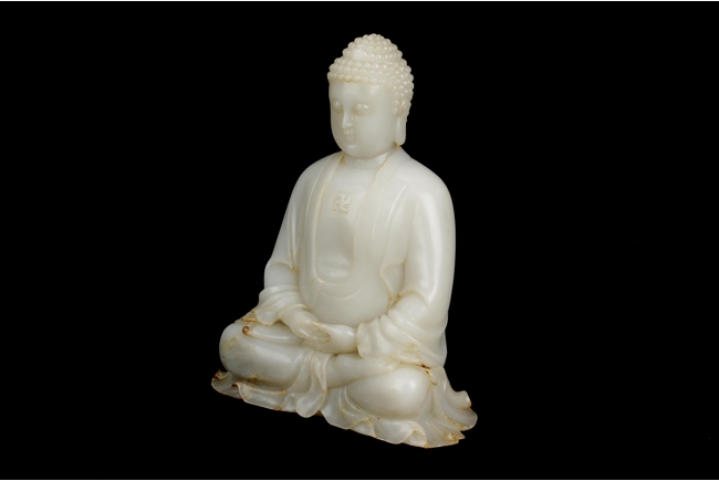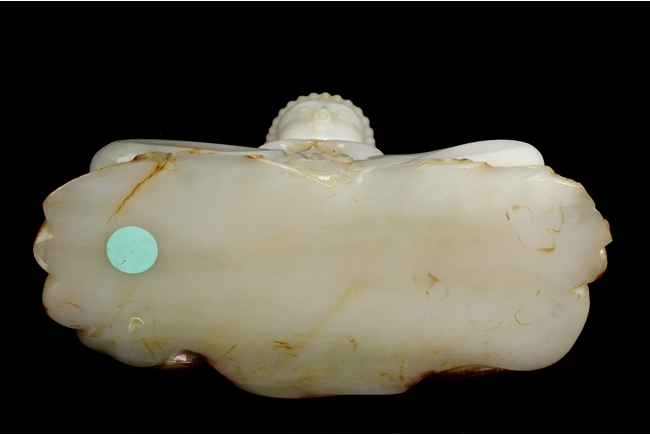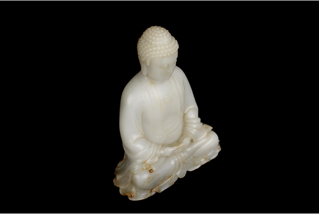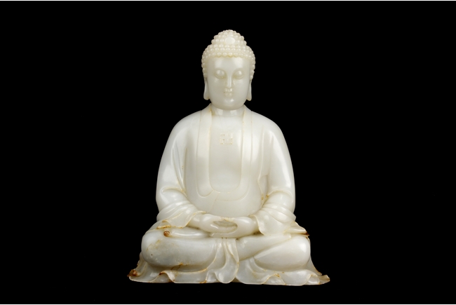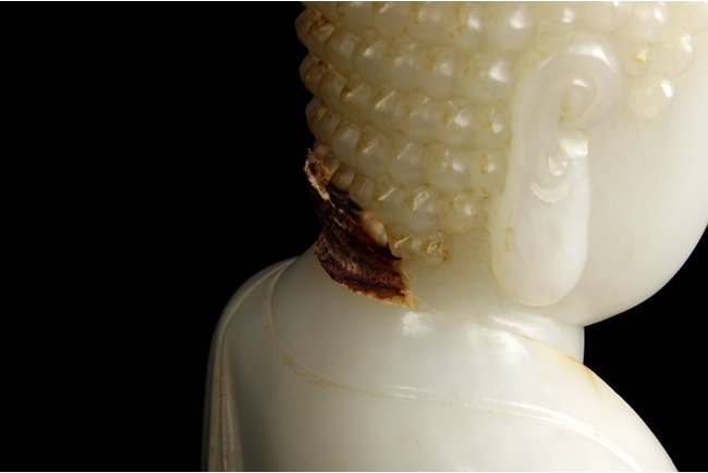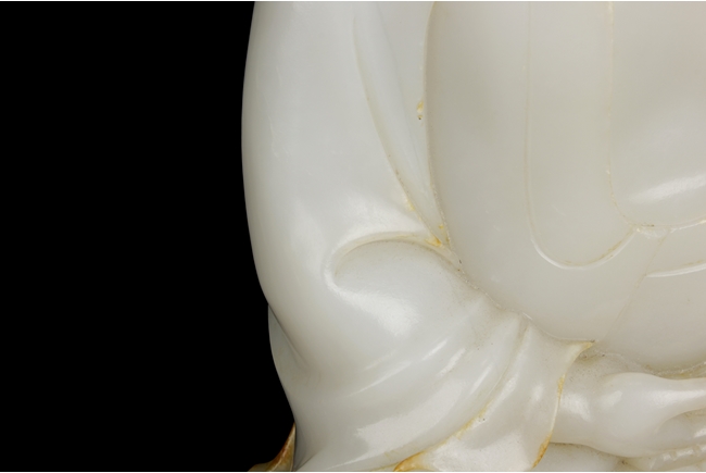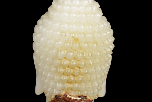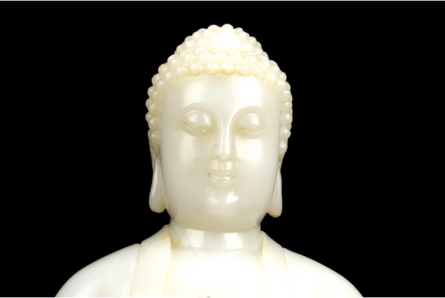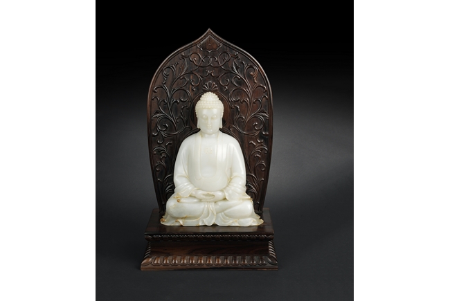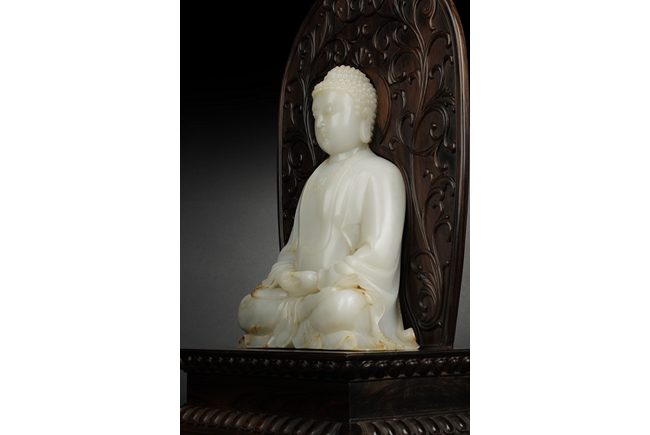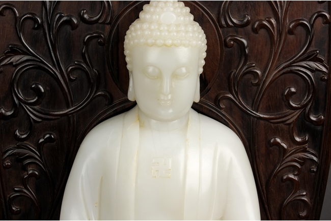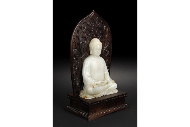 Provenance: Property from an important local estate. A similar but smaller white jade Buddha was sold for $2,322,500 at Christie's, New York, on March 26, 2010. 其中後面頸部黃點為早期木製背光腐爛所致;背光和底座為後配硬木。這件藏品為美國藏家所提供。 此白玉釋迦摩尼佛像雕工精細,神態慈祥、莊嚴、樸實,充分的體現了當年雕刻師對佛祖的愛與尊敬。此尊佛像用料考究,真正地體現了玉白、玉潤、有時代感等特徵。在目前有資料可查的白玉佛像拍品中極為珍貴。此類白玉佛像在2010年3月26日紐約佳士得拍賣行成交,價格為$2,322,500