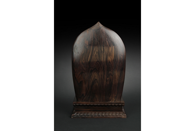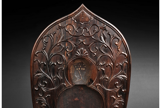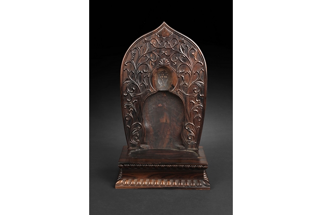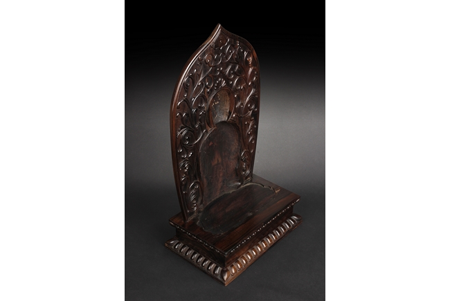"Well carved and portrayed seated in dhyanasana with both hands in dhyanamudra, clothed in loose-fitting robe falling in elegant folds leave the chest bare, showing the Wan symbol, the serene face with downcast eyes and gentle smile flanked by pendulous ears, the head and domed ushnisha covered with tight curls, all supported on a hardwood double lotus plinth with mandorla backdrop. The backside neck area still has remains of old wooden mandorla pieces, as the current plinth and mandorla are not original. The stone of pale white color and smooth surface. 18th century.