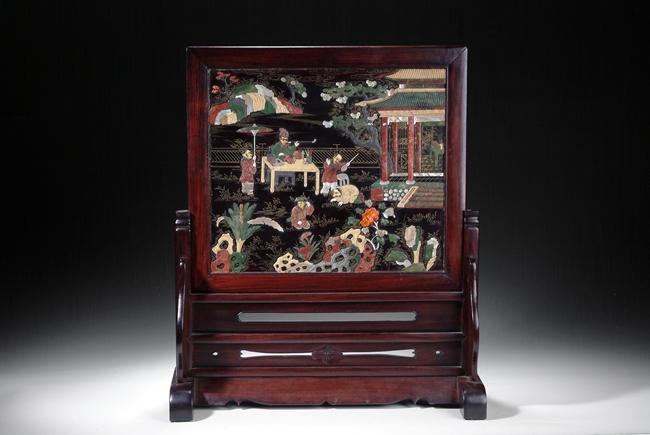 This table screen center panel was embellished with jade, coral, soap stone, mother of pearl, and ivory to depict a garden scene. The panel is mounted in another frame supported in a hardwood stand. Qing Dynasty period