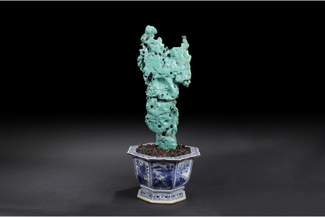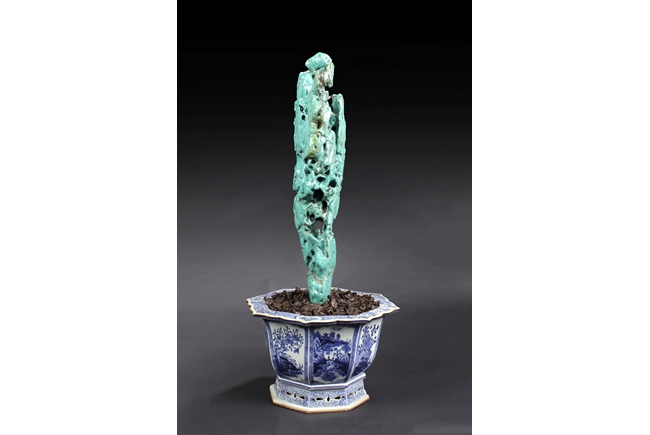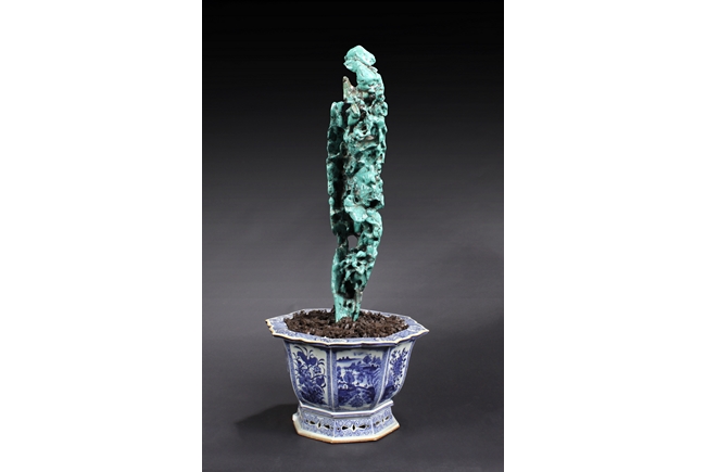 Of naturalistic rockwork design, the malachite stone fitted in a blue and white planter,the color mostly teal with some russet, the center occasionally hollowed, and very smooth surface. The blue and white planter is in octogonal form with eight lobes, each depicting a landscape scene. 18th century. The painting depicts a few branches of narcissus flowers growing next to a shapely rock, with a small lizard next to it. Chinese calligraphy, artist seal and mark "Zong Jianting" on the top left corner.