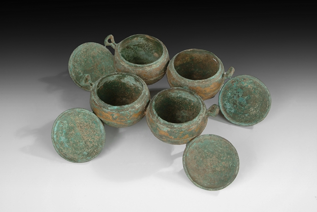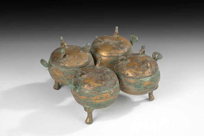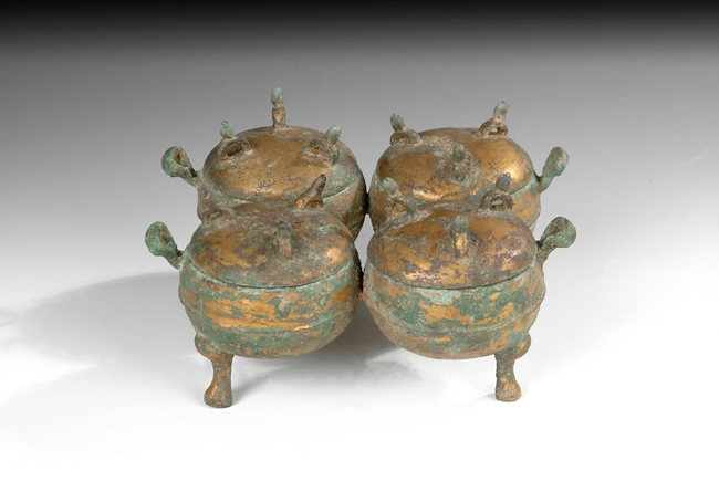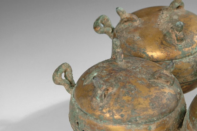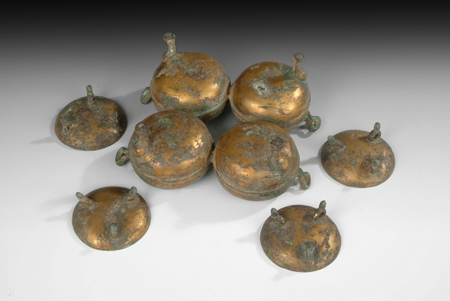 Of slightly compressed globular shape, each gilt bronze Ding ceremonial vessel has one high standing leg, one round handle, and a lid with three goats on top. One lid has a small hole. 17th Century.