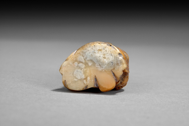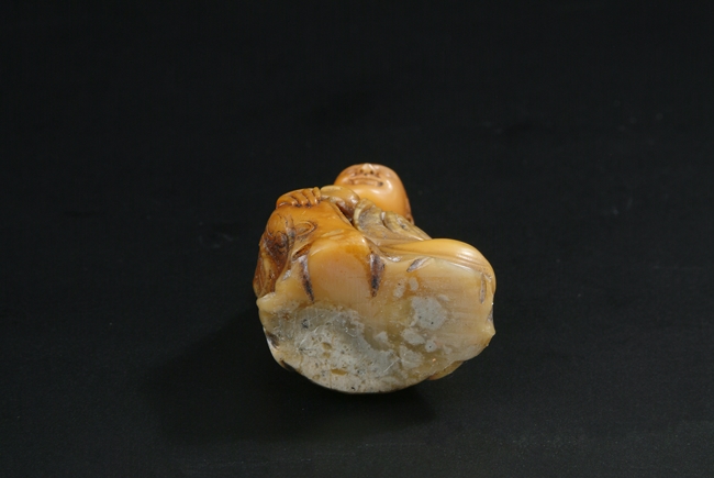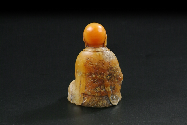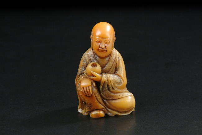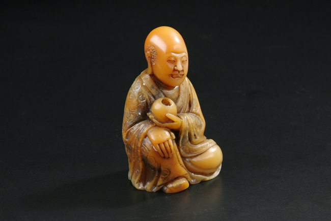 Finely carved seated in Rajalatitasana revealing the bare foot, both hands on the raised knee, holding a small cup in his left hand, dressed in long robes with heavy folds, the hem delicately decorated with petal patterns, the serene face with elegantly carved features. Republic period.