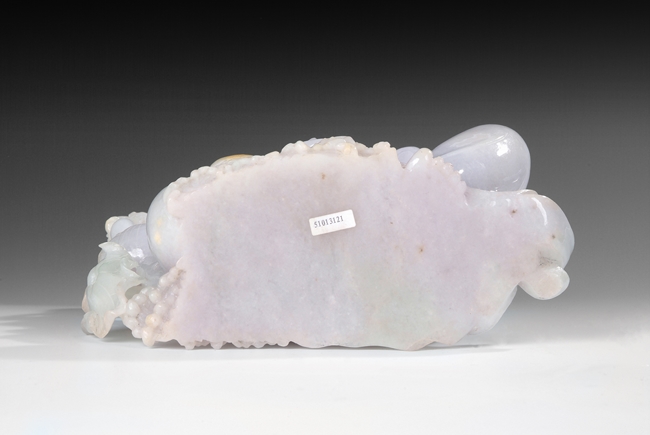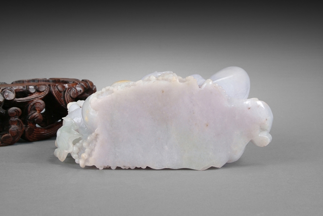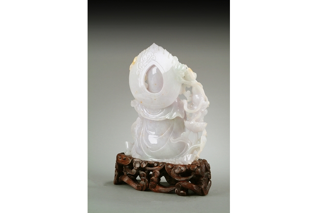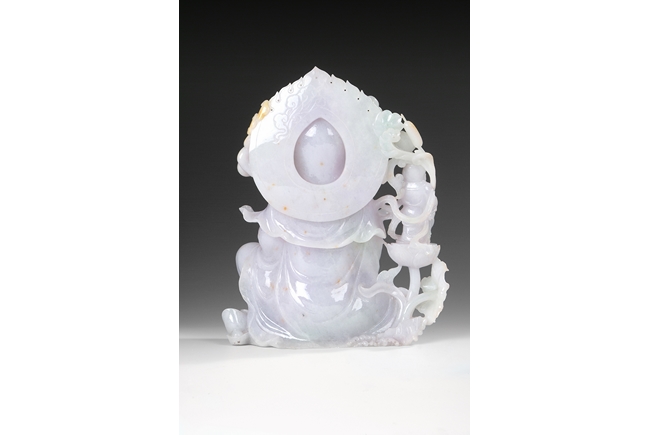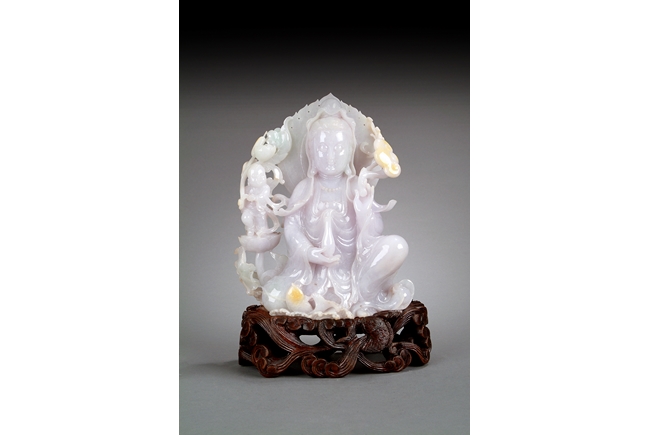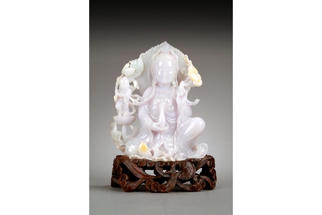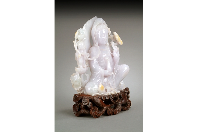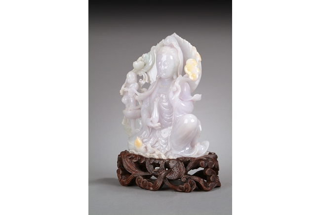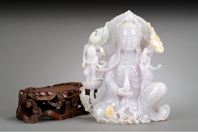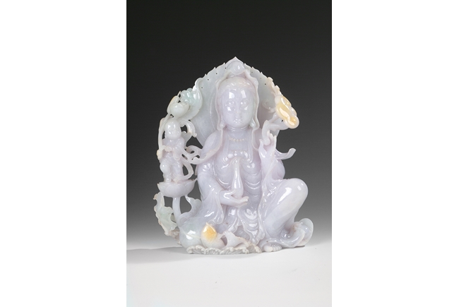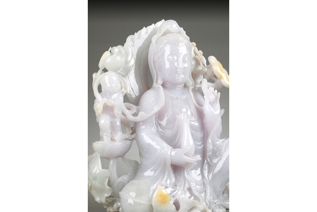 Seated on an ocean wave pattern stand, the Guanyin holds small bottle vase on her right hand, and a large Lingzhi on her left hand, with a serene expression. A small child standing on a lotus seed pod next to the Guanyin, with a lotus flower in his hands. The stone of slightly lavender color with occasional hint of green color, and few patches of russet.