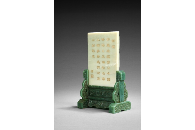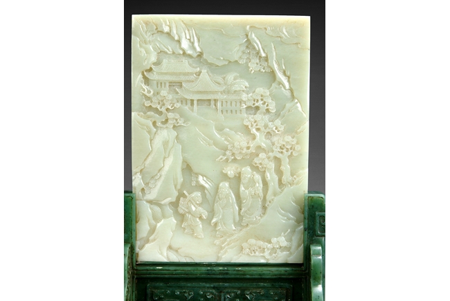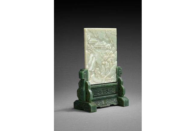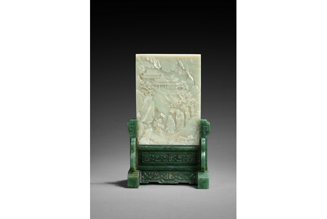 A similar jade table screen with larger dimensions (Height 34.7cm, width 23.5 cm) is illustrated in "Jade: Ch'ing Dynasty Treasures from the National Museum of History, Taiwan", Taiwan, 1997, pp. 82, no. 26. 類似玉屏連碧玉座可參考"清代玉雕之美",台灣國立歷史博物館,1997年出版,82頁,26號