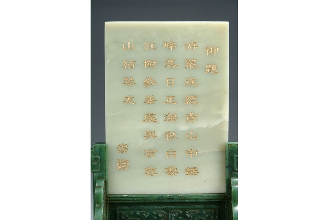 Carved to one side in relief depicting a mountain scene, showing mountains, village, trees, and two elders with a child, the other side with a Chinese poem calligraphy writing, all fitted on a dark green nephrite stand, intricately carved with dotted patterns. Qing Dynasty period.