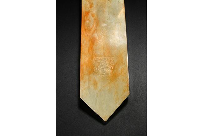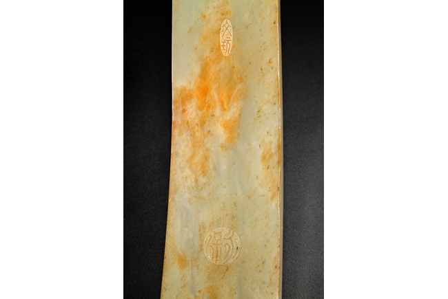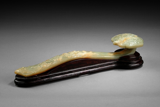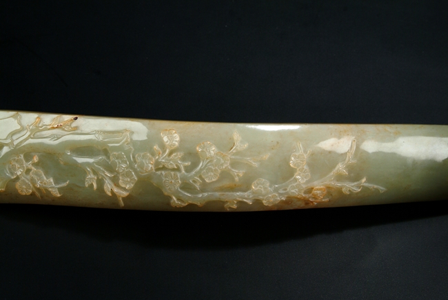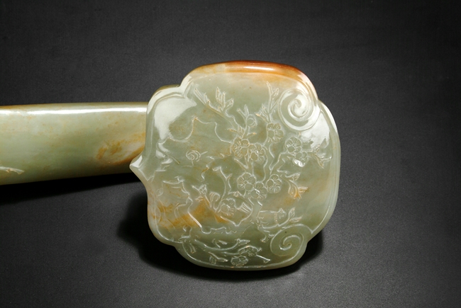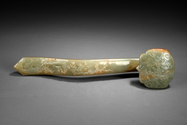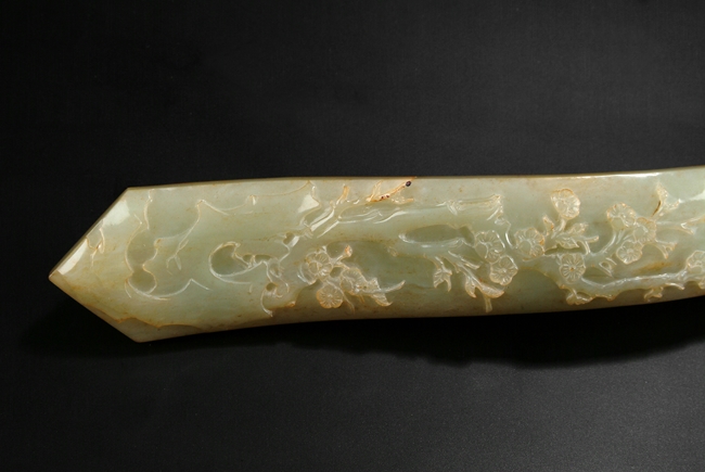 The shaft intricately carved with plum trees, branches, flowers, and viewing stones, extending from bottom to near-top, the large head further carved with more blooming plum flowers with leafy branches. The back carved with four character "QIANLONG" mark, along with two smaller marks on the shaft. Republic period.,