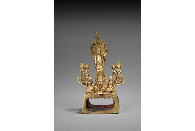 The figure is well modeled wearing crisply draped robes and a cowl, and shown standing, with her left hand near her shoulder, her face is modeled with small features and a peaceful expression, framed behind by the petal-shaped mandorla, seven disciples each sitting or standing with a different position besides her. Qing Dynasty period, imitating North Qi Dynasty.