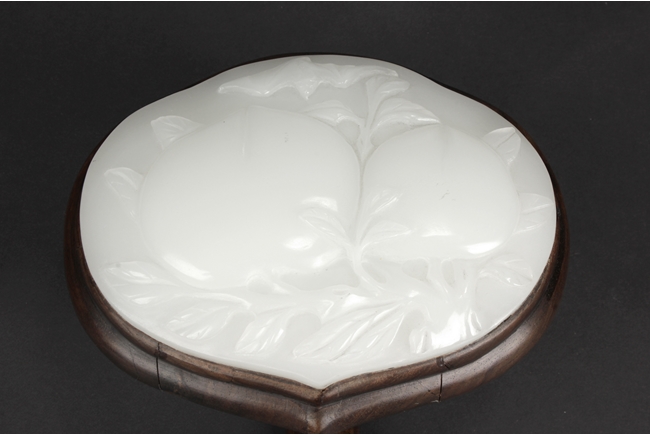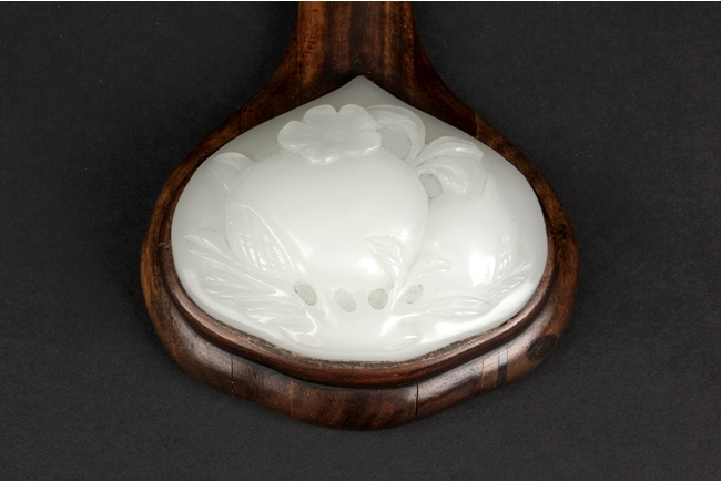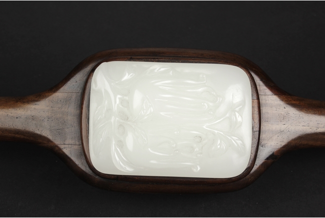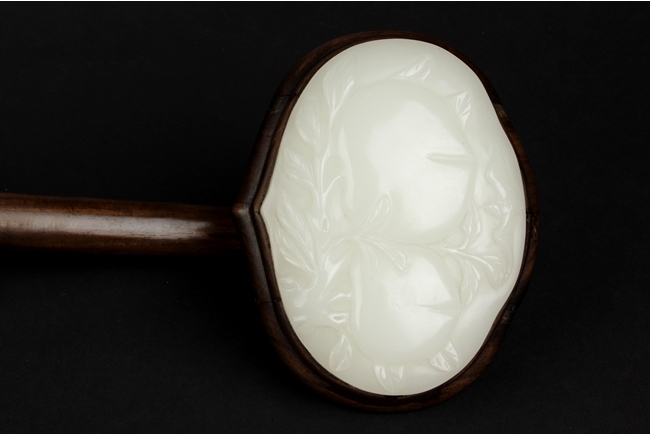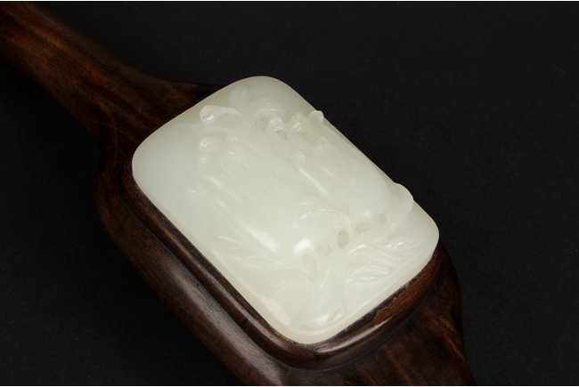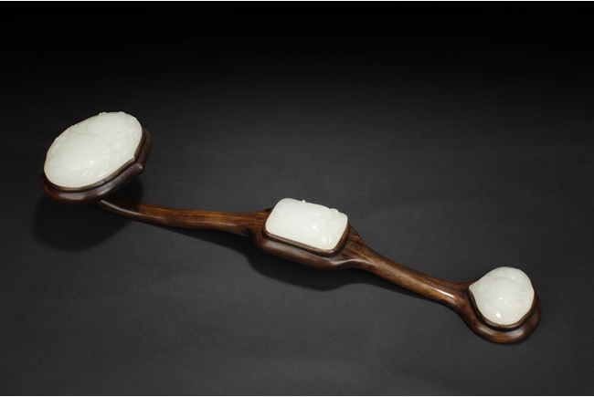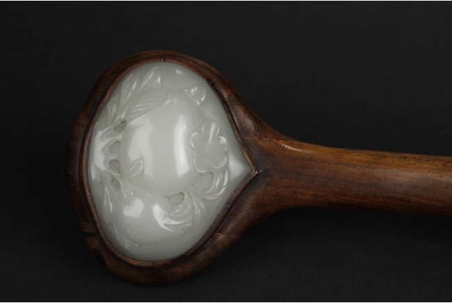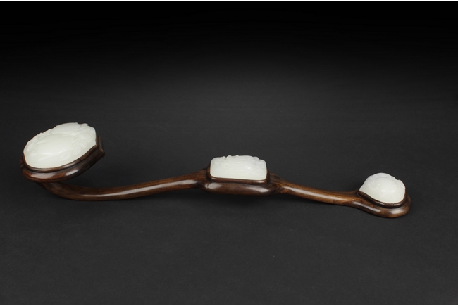 The Ruyi is decorated with three white jade pieces, the round shaped jade on top of Ruyi head is carved with two longevity peaches, the rectangular jade at center is carved with flowers, the jade at bottom is carved with a fruit, all embedded on a smooth and natural toned Huanghuali wood handle. 19th century.