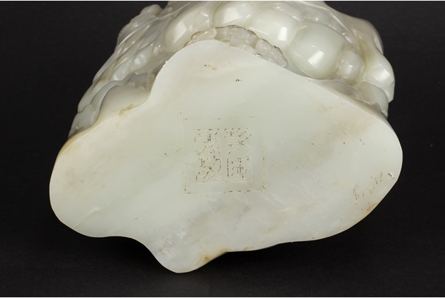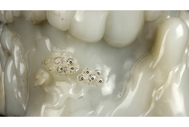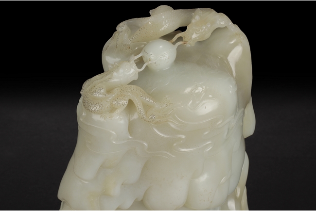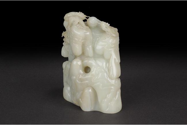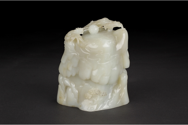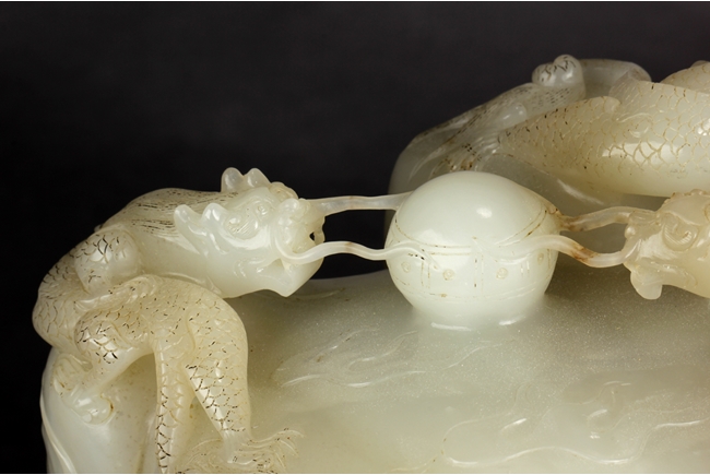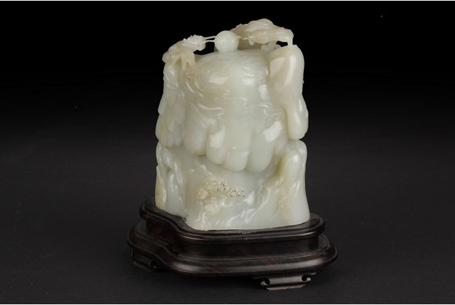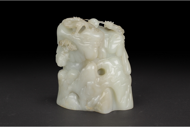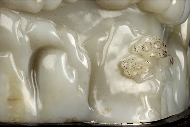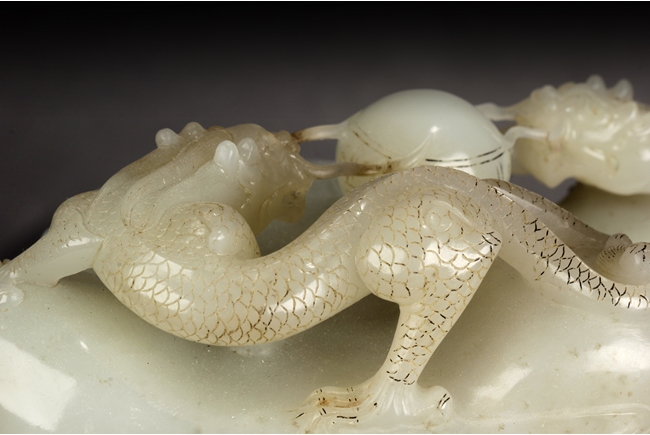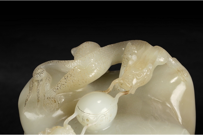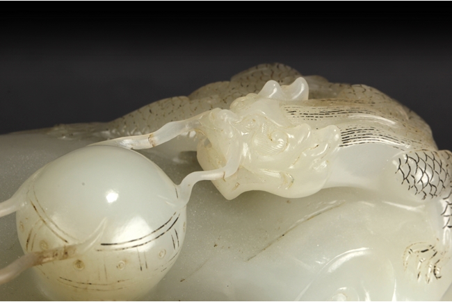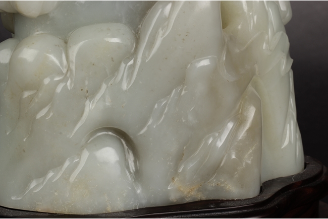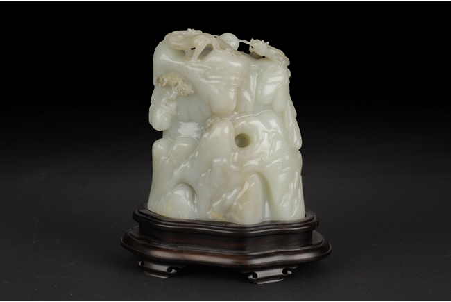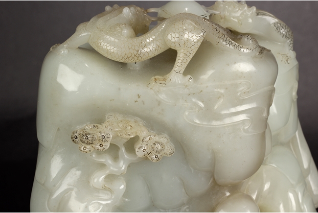 This intricately carved jade mountain depict a pair of five clawed dragons pursuing a sacred pearl on top of the mountain. There are also some pine trees growing out of the cliff surface. The carvings, color, and patina of this jade mountain are excellent. 19th century.