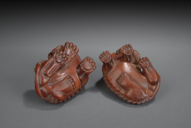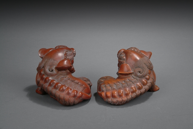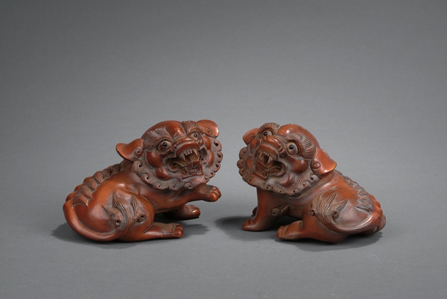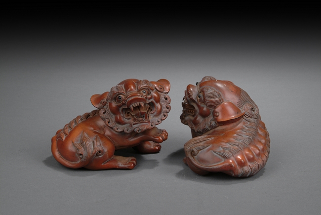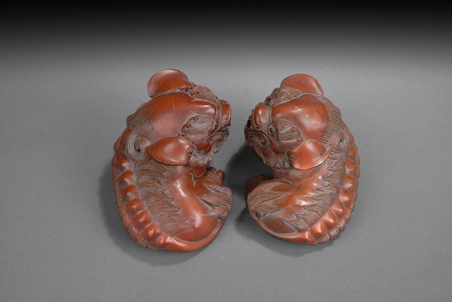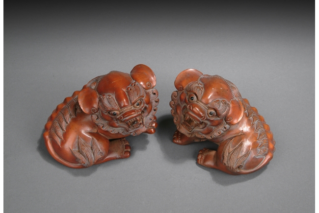 The pair of lions rests on the ground with head turned, with menacing looks expressed by wide open mouth, long teeth, bulging eyes, and raised manes. One lion has its front right paw slightly raised. Republic period