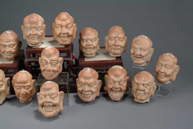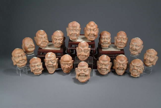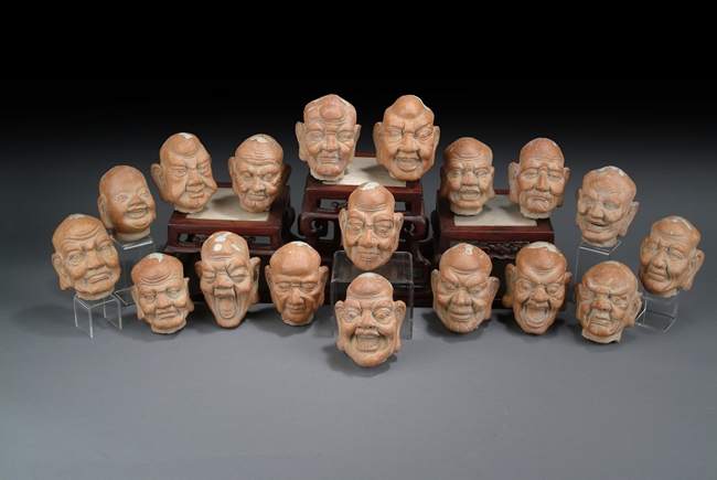 Expertly carved, each Arhat features a vastly different and exaggerated expression. Most of the Arhats have wide nose, thick eyebrows, and long earlobes. White marks on top of all Arhats. Late Yuan Dynasty or early Ming Dynasty period.