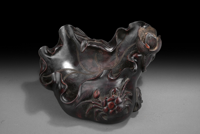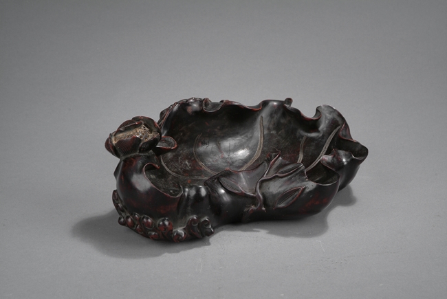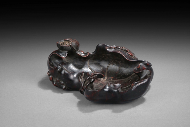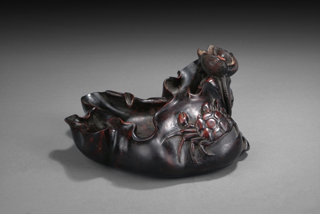 The figure carved as a large lotus leaf and blossoms, well-hollowed to form a receptacle, all borne on the entwined stems of leaves, gradually extending up to the sides, a single crab residing near the lotus, the smoothly polished Zitan of rich black with hints of red. 18th century.