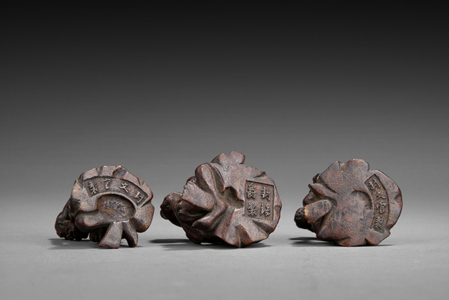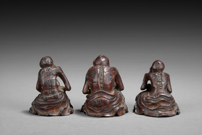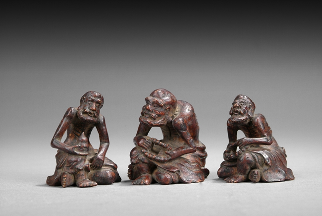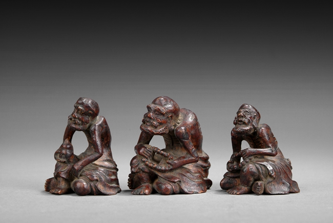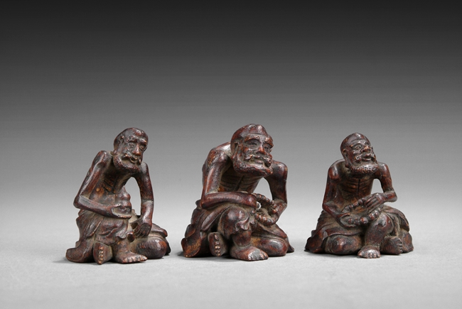 All three figures of Amitayus were in similar posture, one leg bent sideways on ground, with another leg upright, acting as support for his hand. Their bodies hunched forward slightly, all with serene expressions, flared beards, and wearing rags covering their lower body. One figure is holding a gourd in his hand, while the other two are holding large prayer beads. Artist marks on the bottom, attributing two figures to "FENG WENGUAN" and one figure to "FENG XIJUE". Qing Dynasty period.